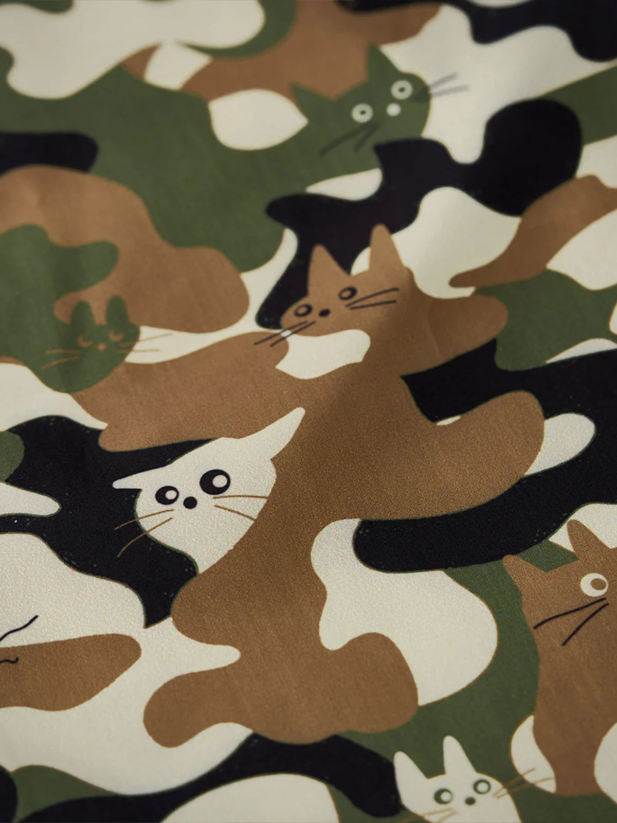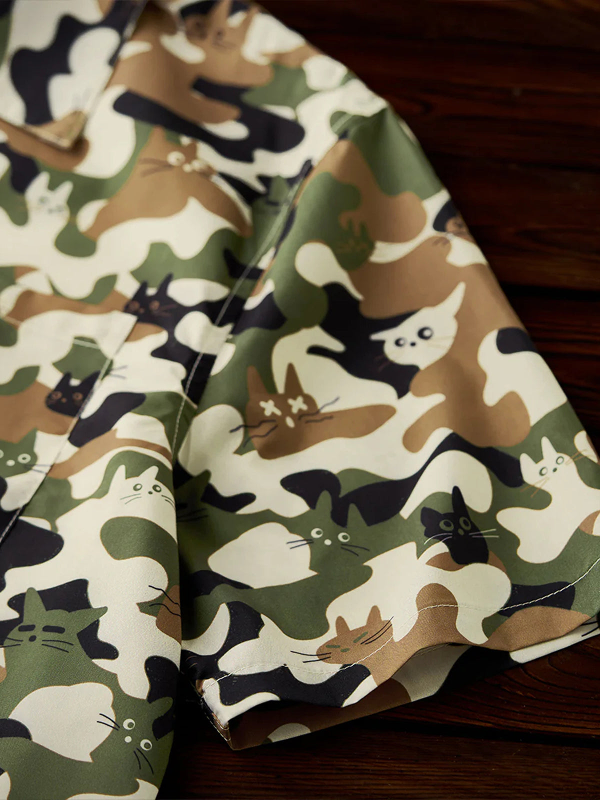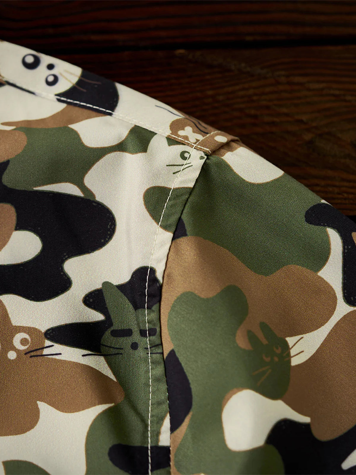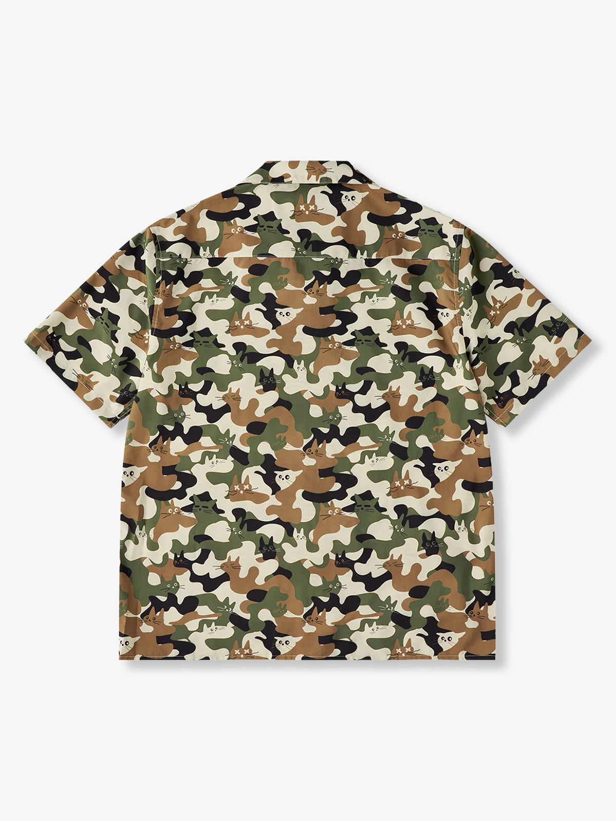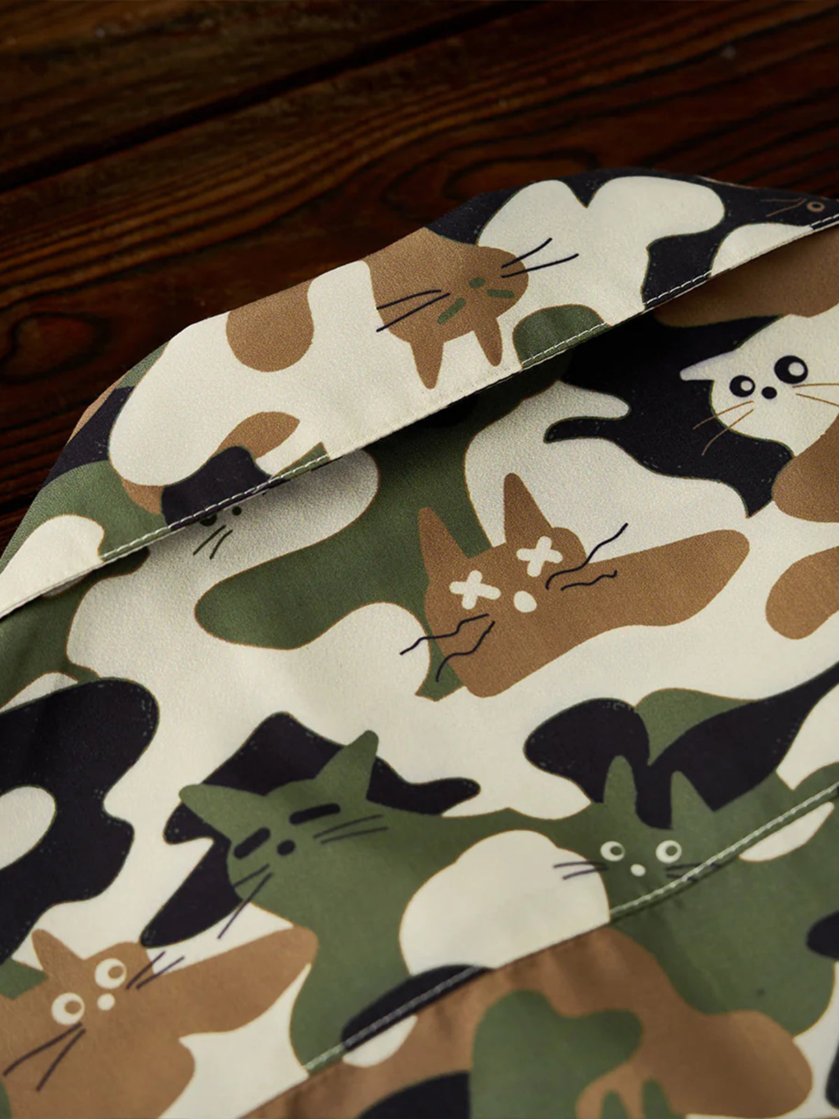 Cat Mixed with Camouflage Pattern Military Style Open Collar Shirt
