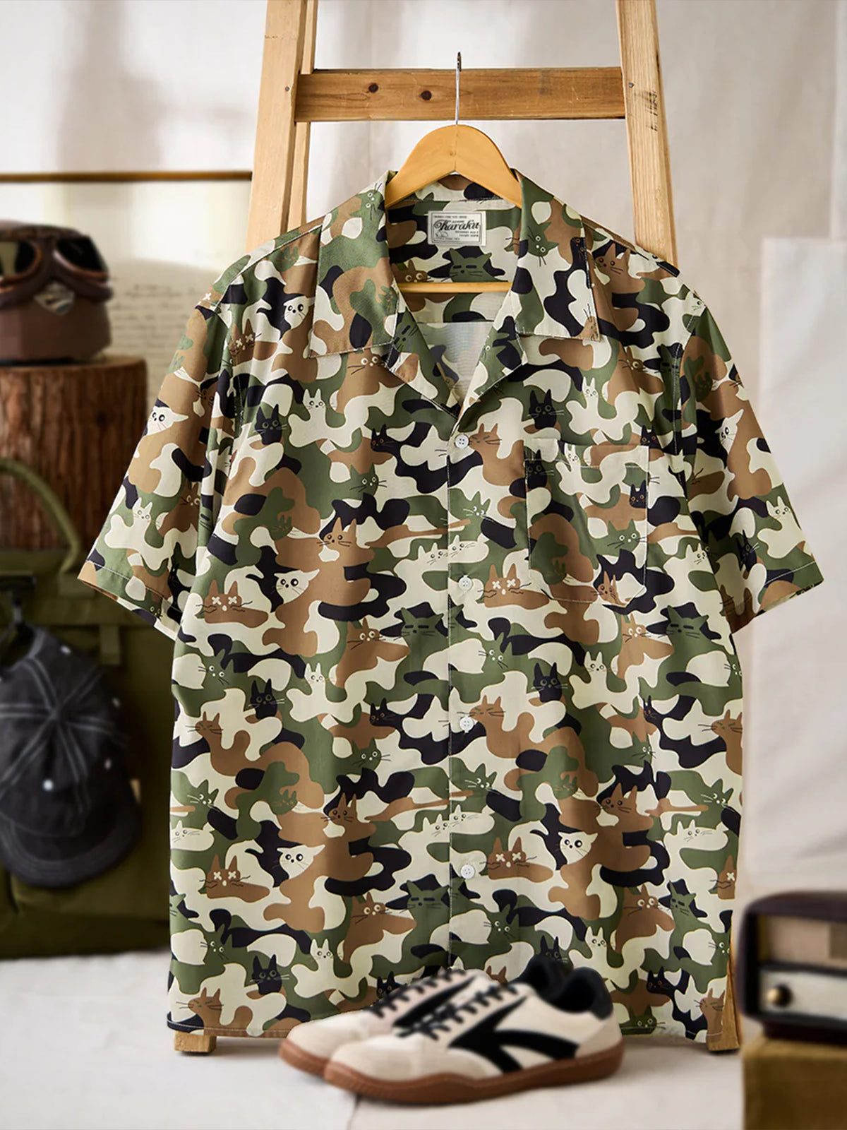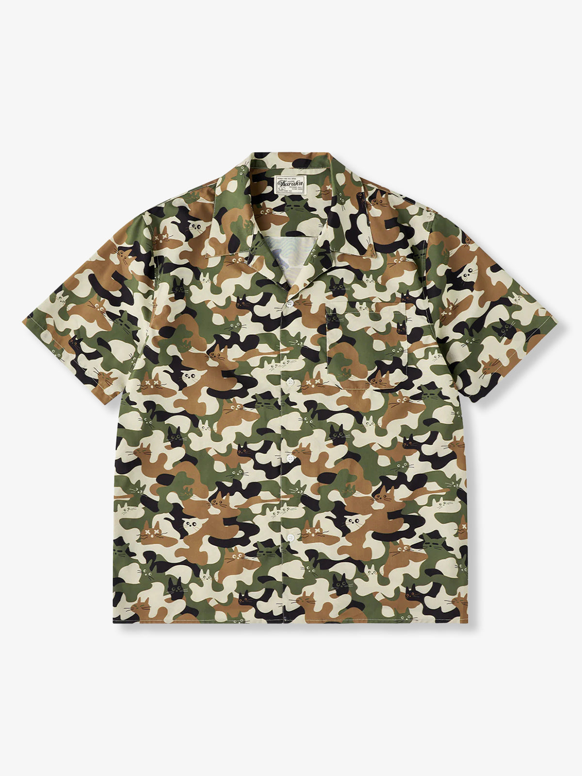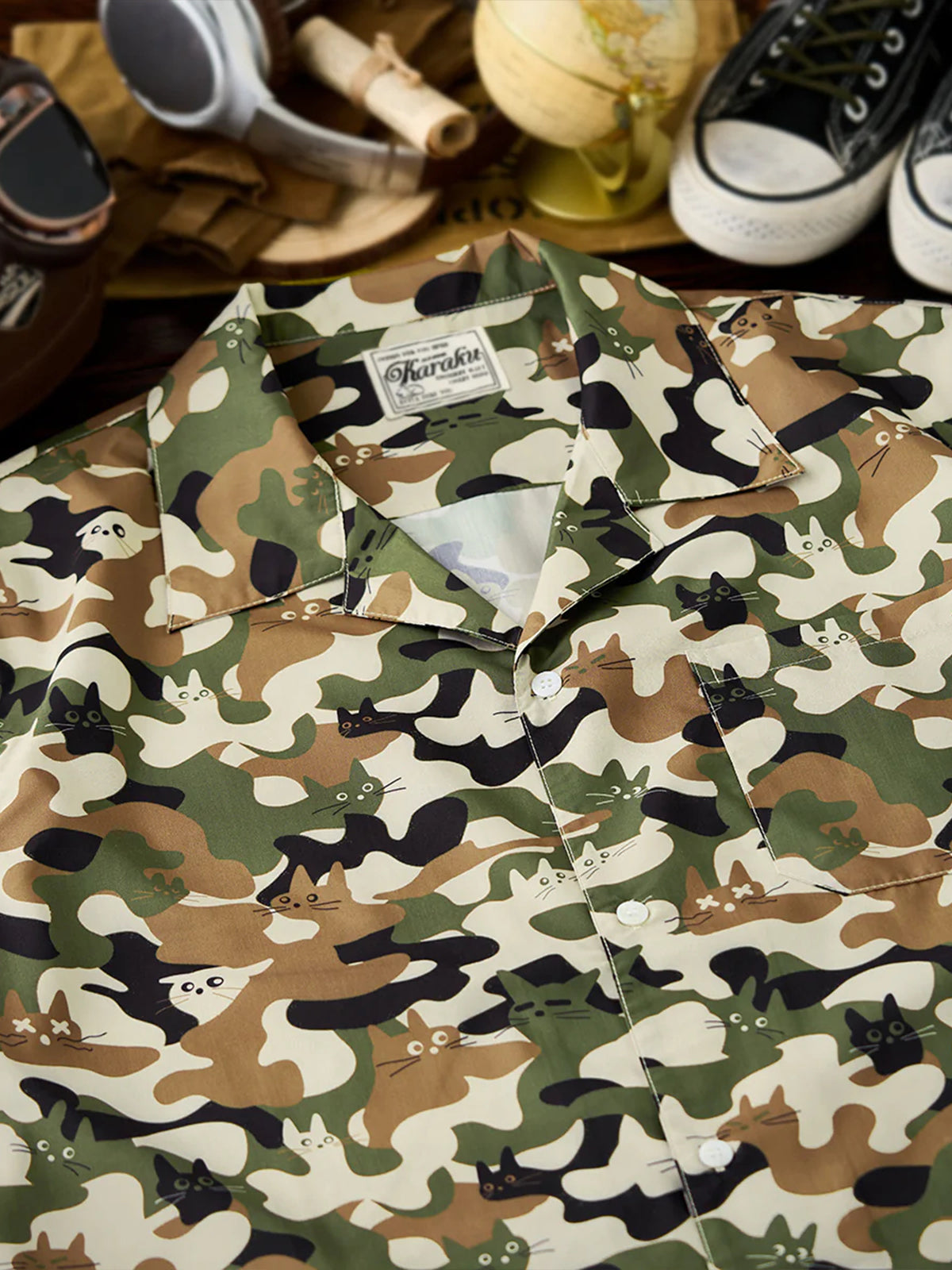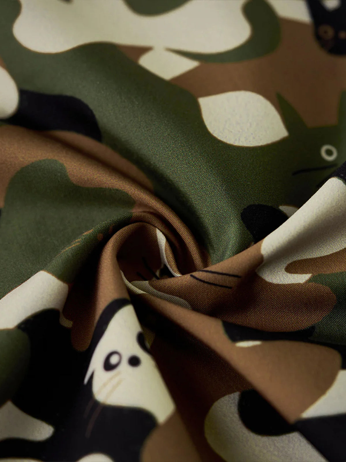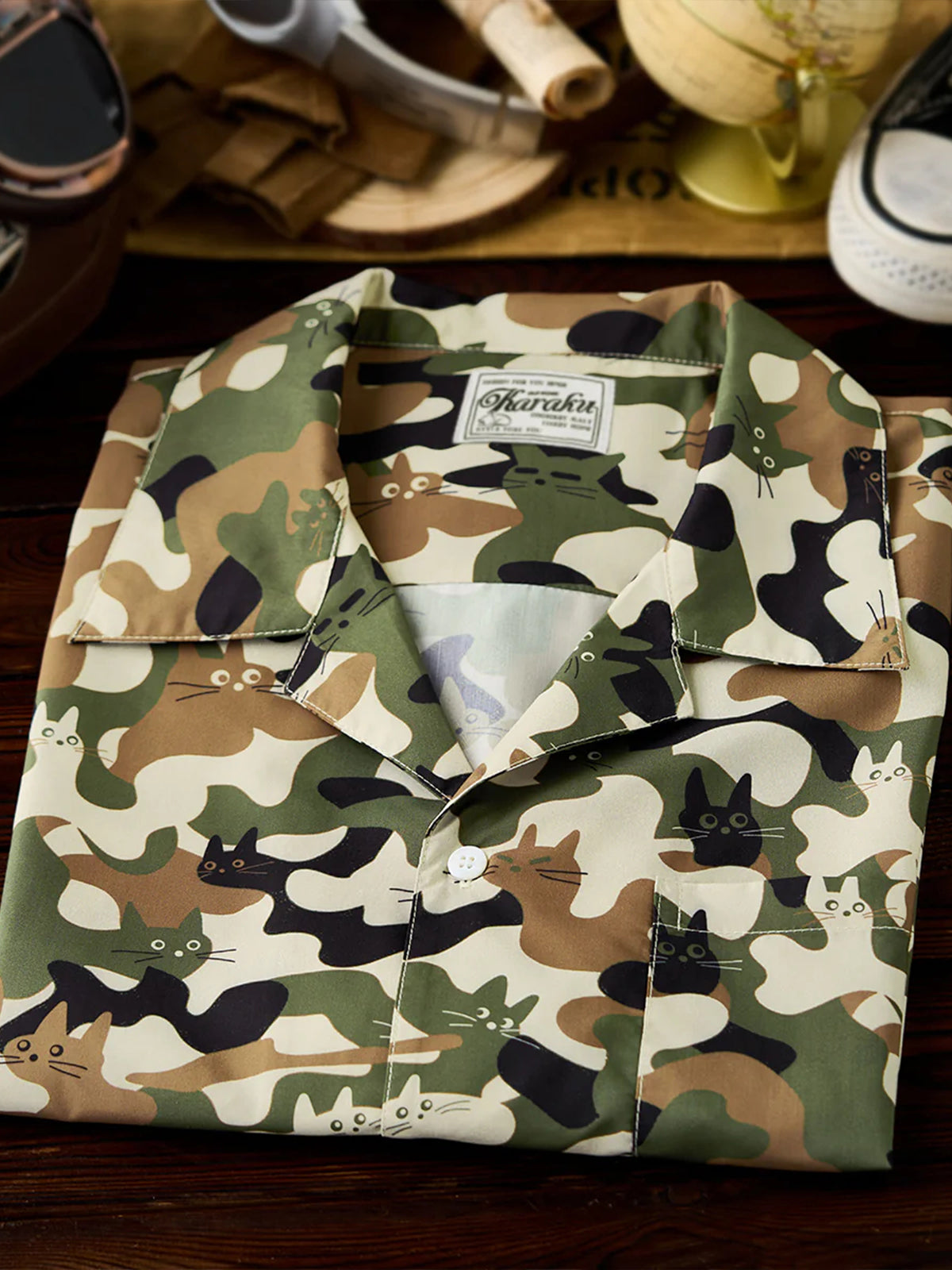 Cat Mixed with Camouflage Pattern Military Style Open Collar Shirt