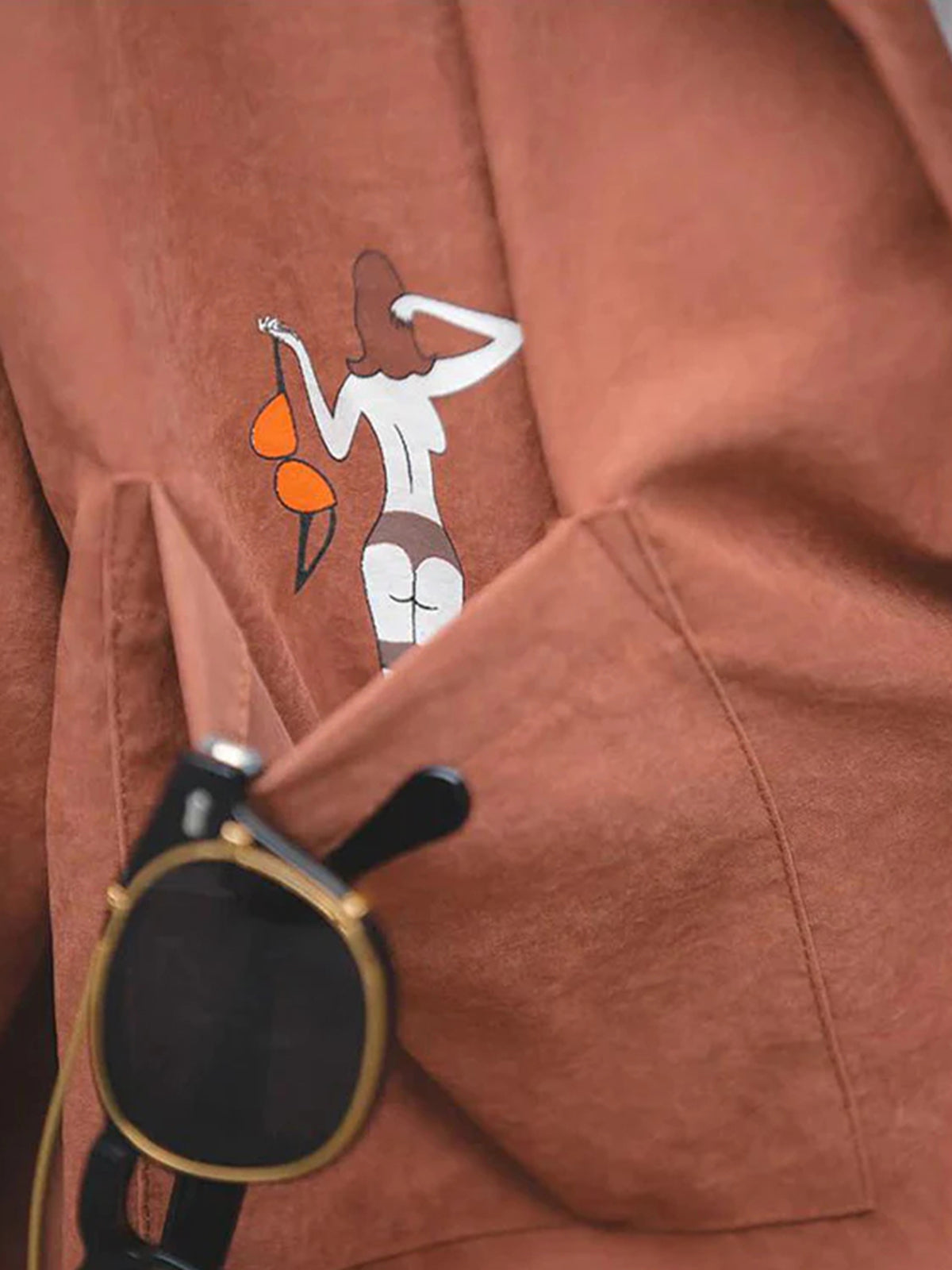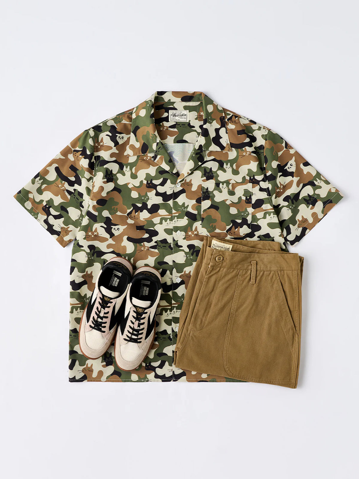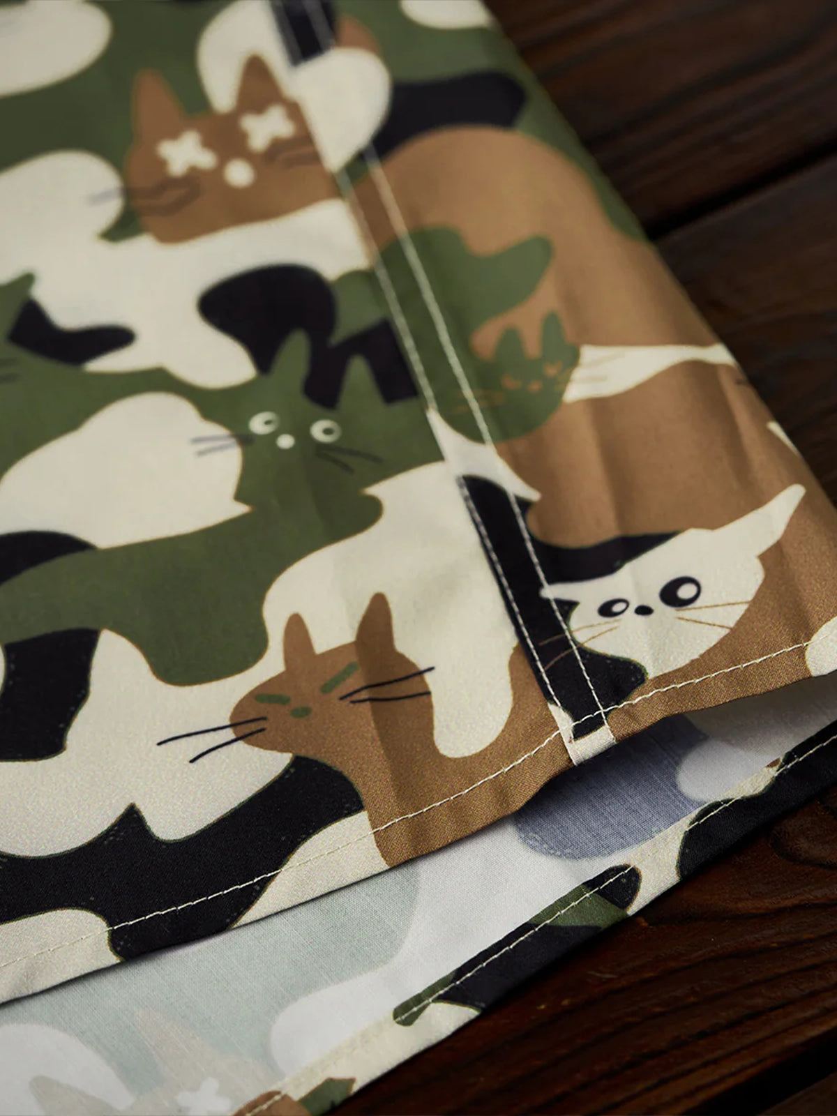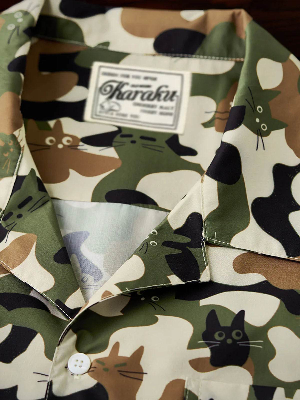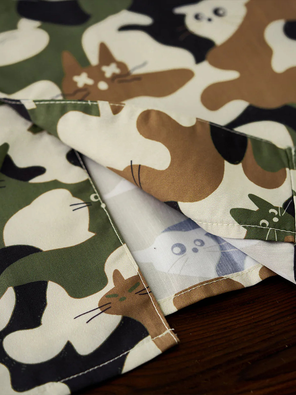 Cat Mixed with Camouflage Pattern Military Style Open Collar Shirt