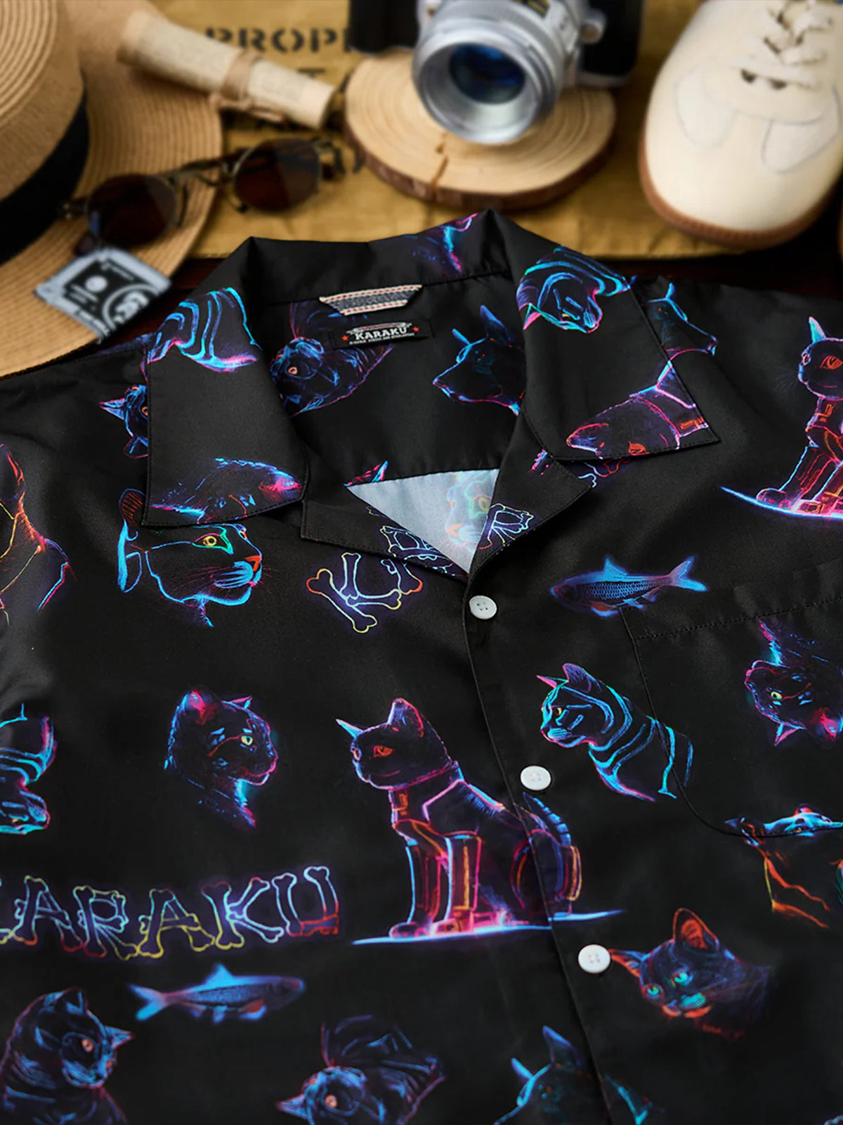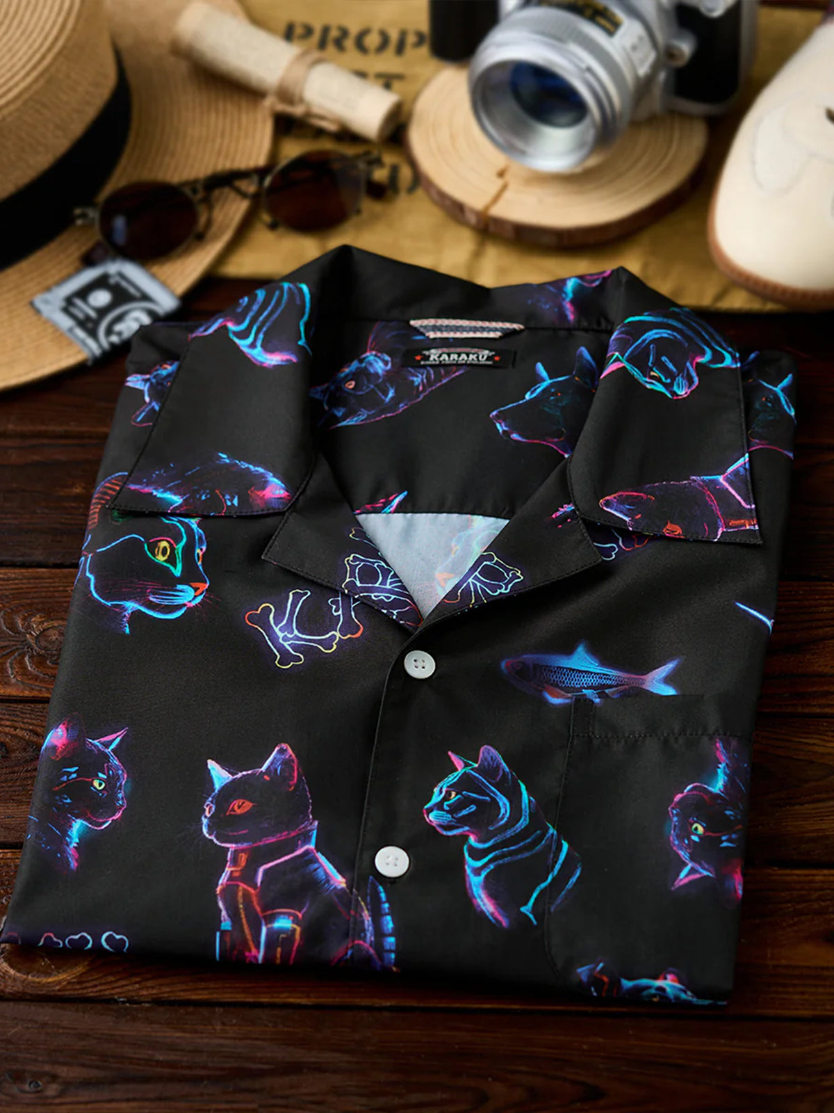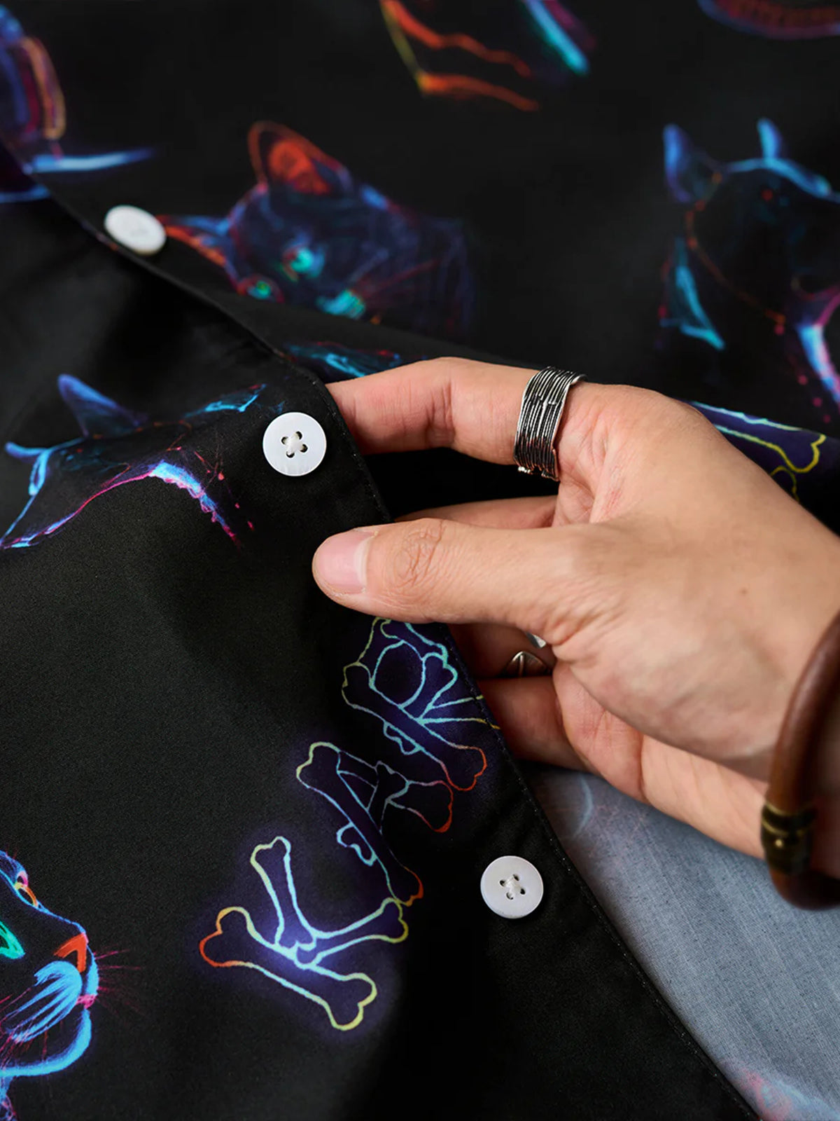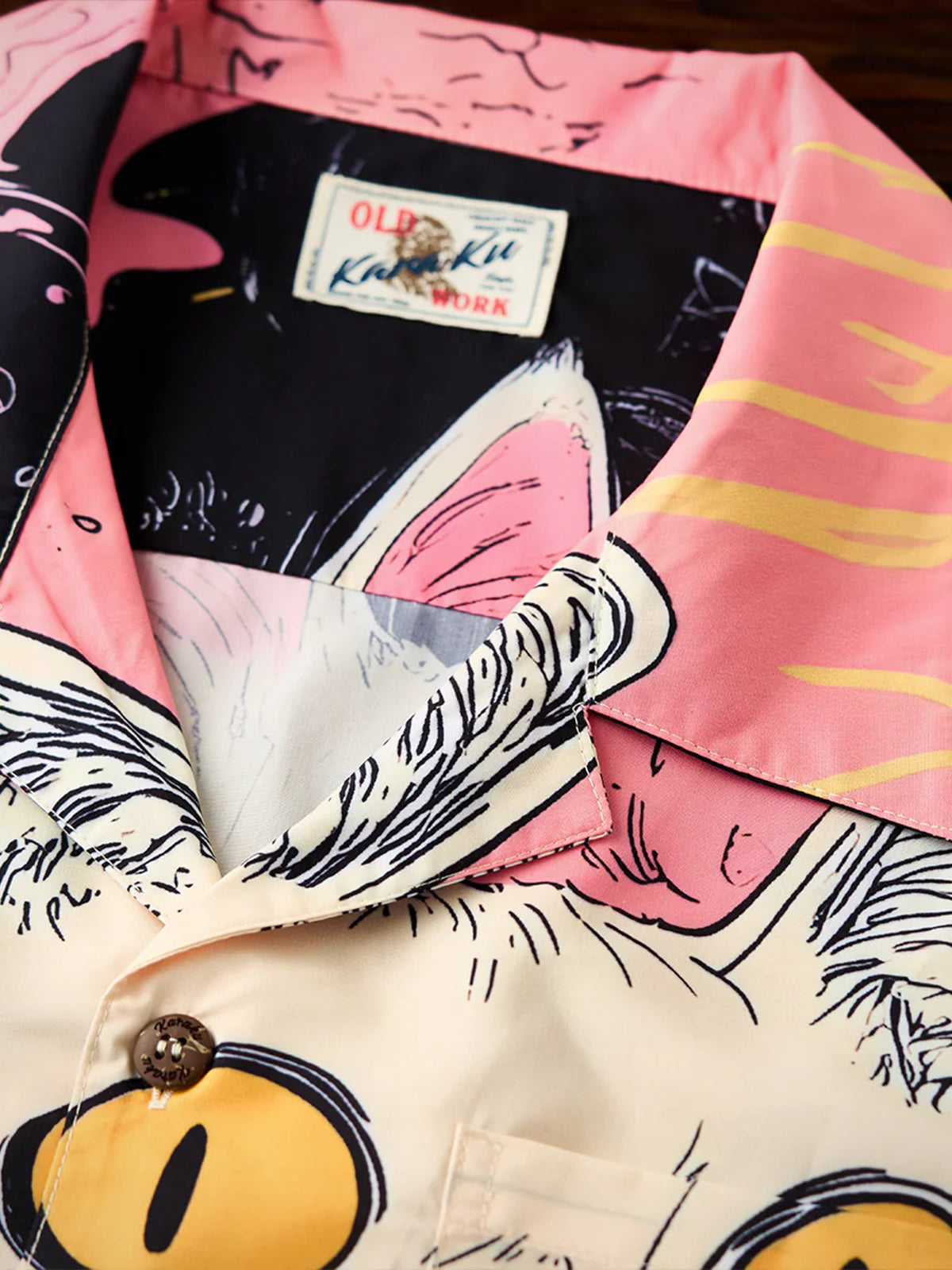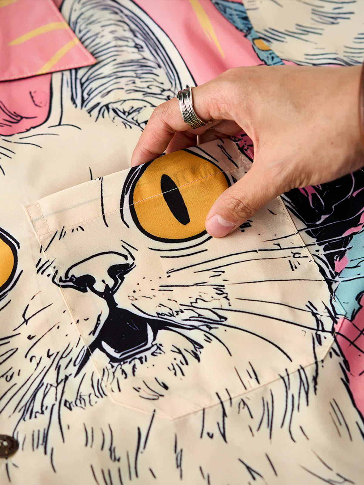 "Cat's Fantasy Universe" Asymmetric Print Open Collar Aloha Shirt