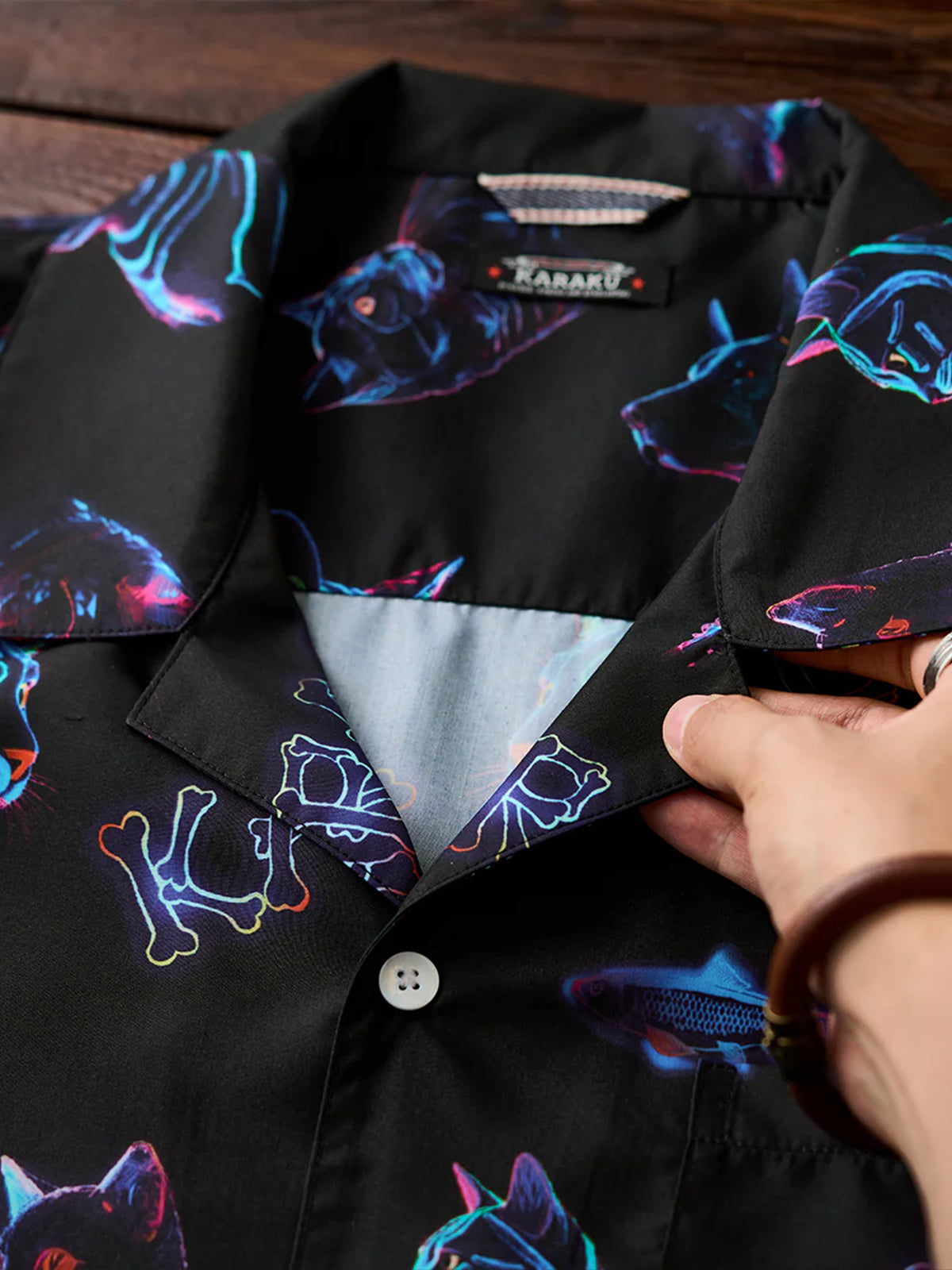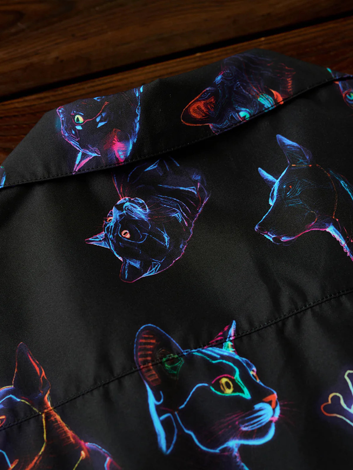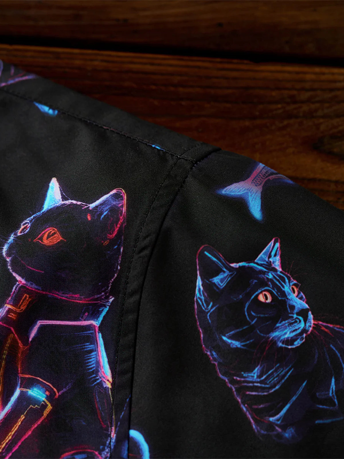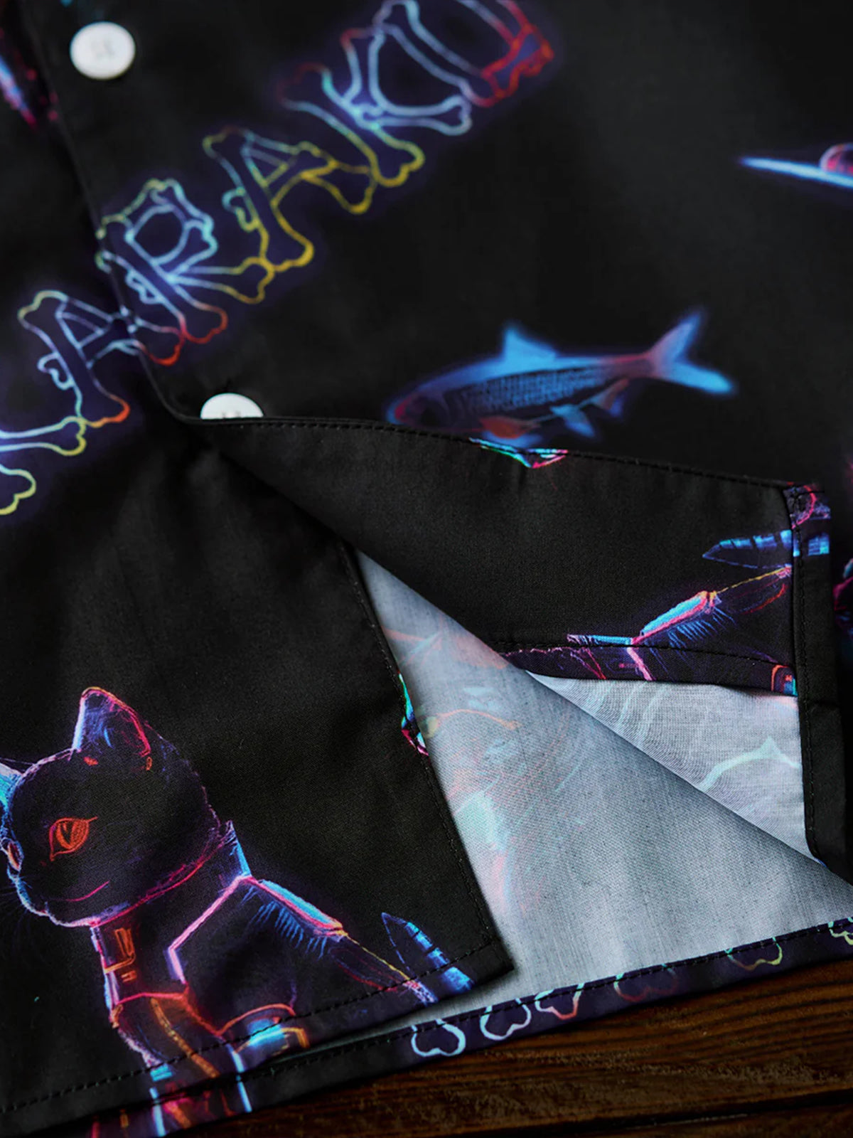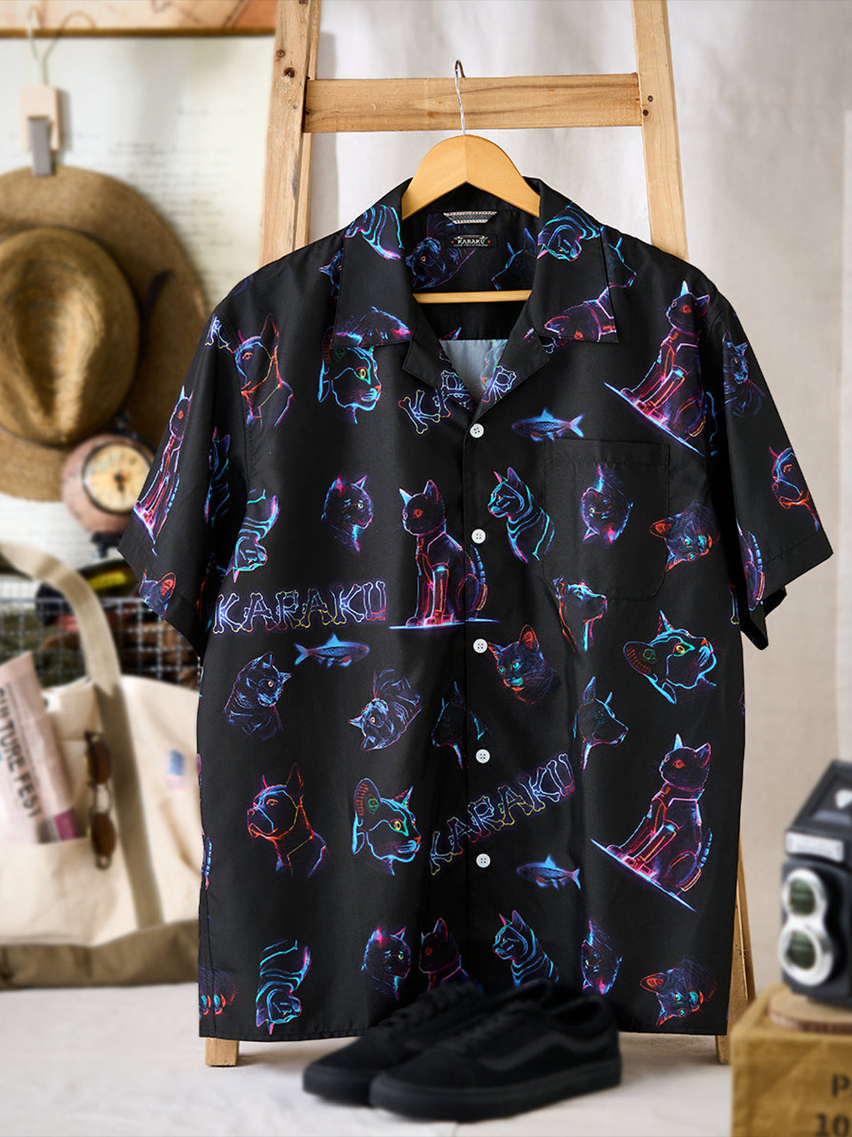 "Cat's Fantasy Universe" Asymmetric Print Open Collar Aloha Shirt