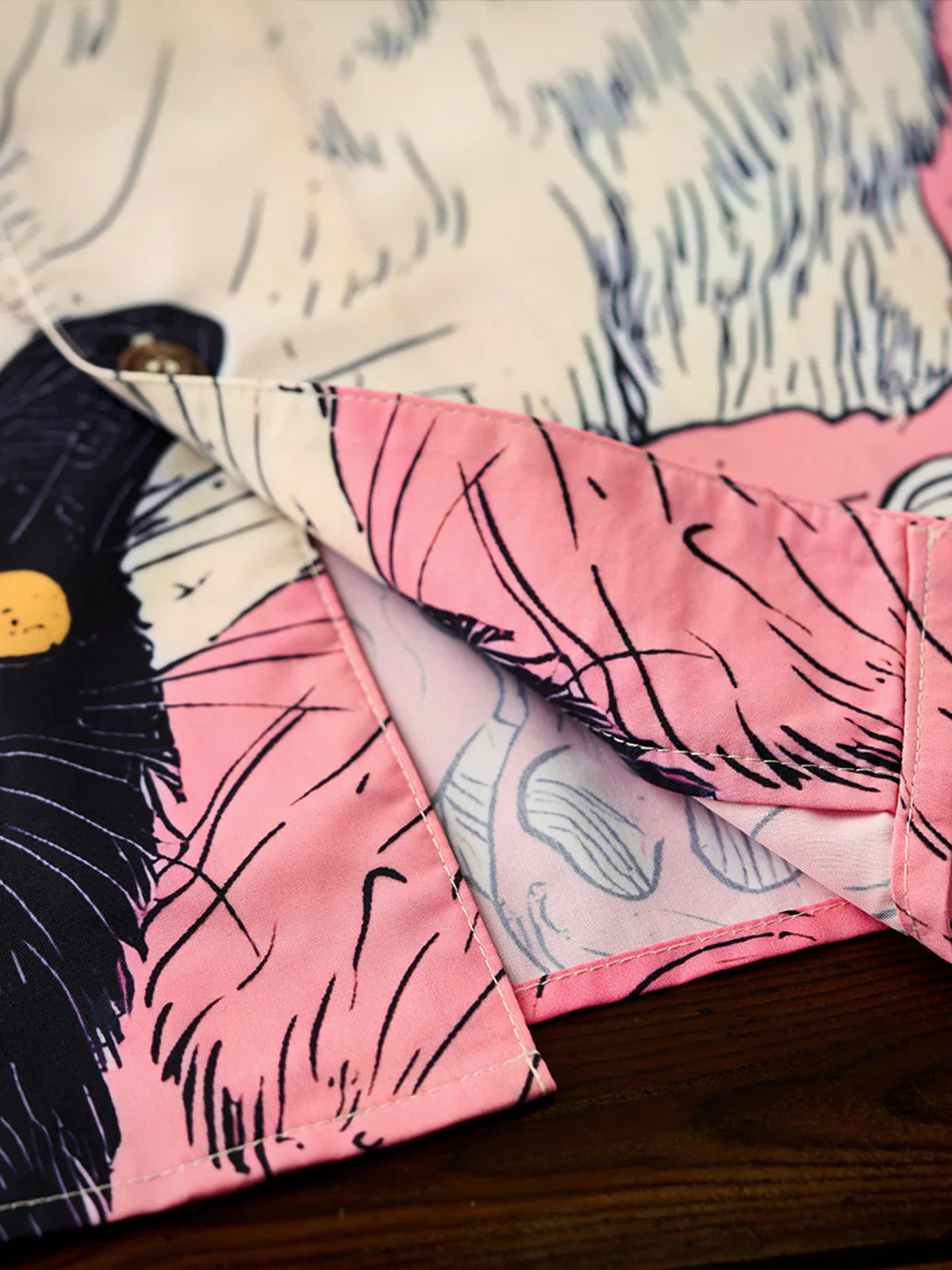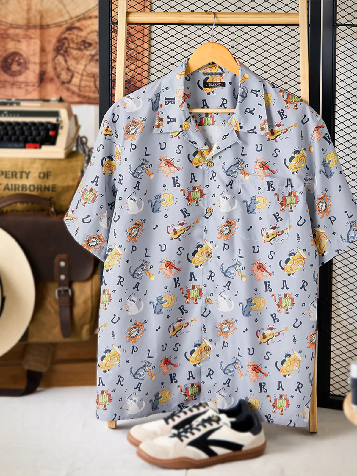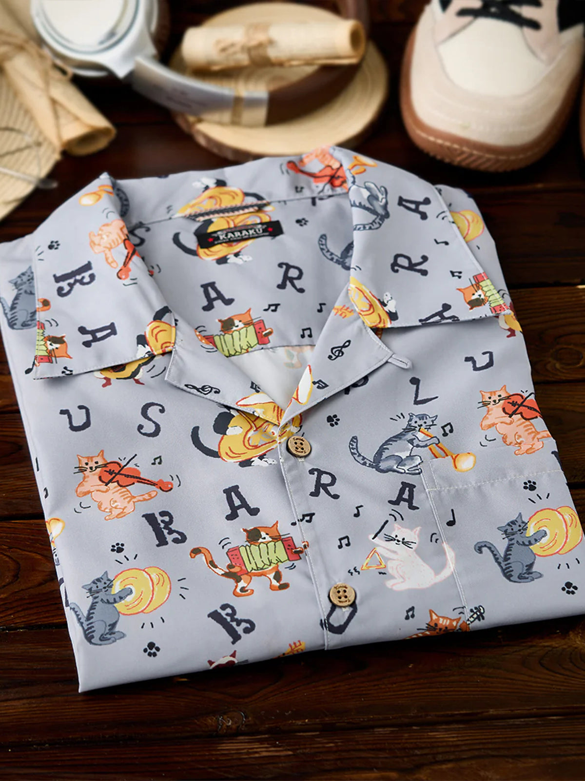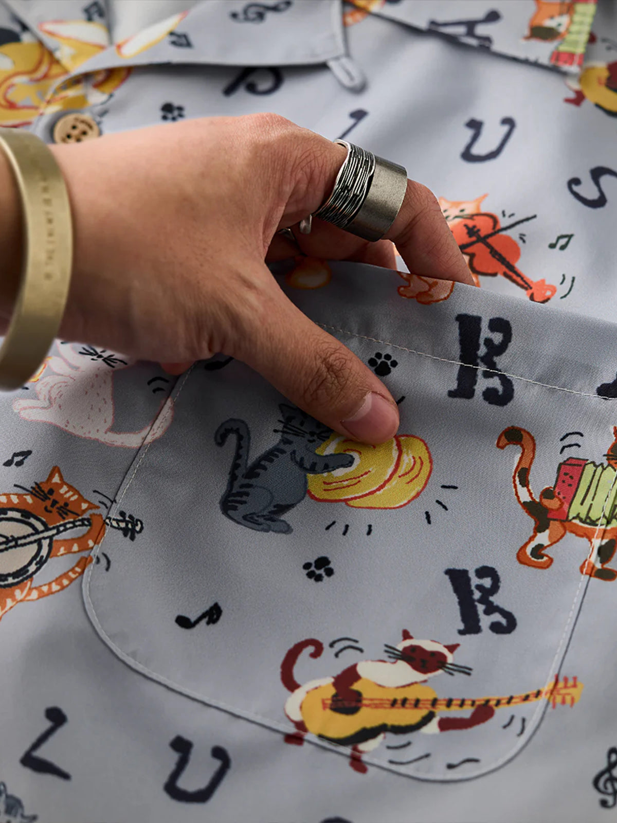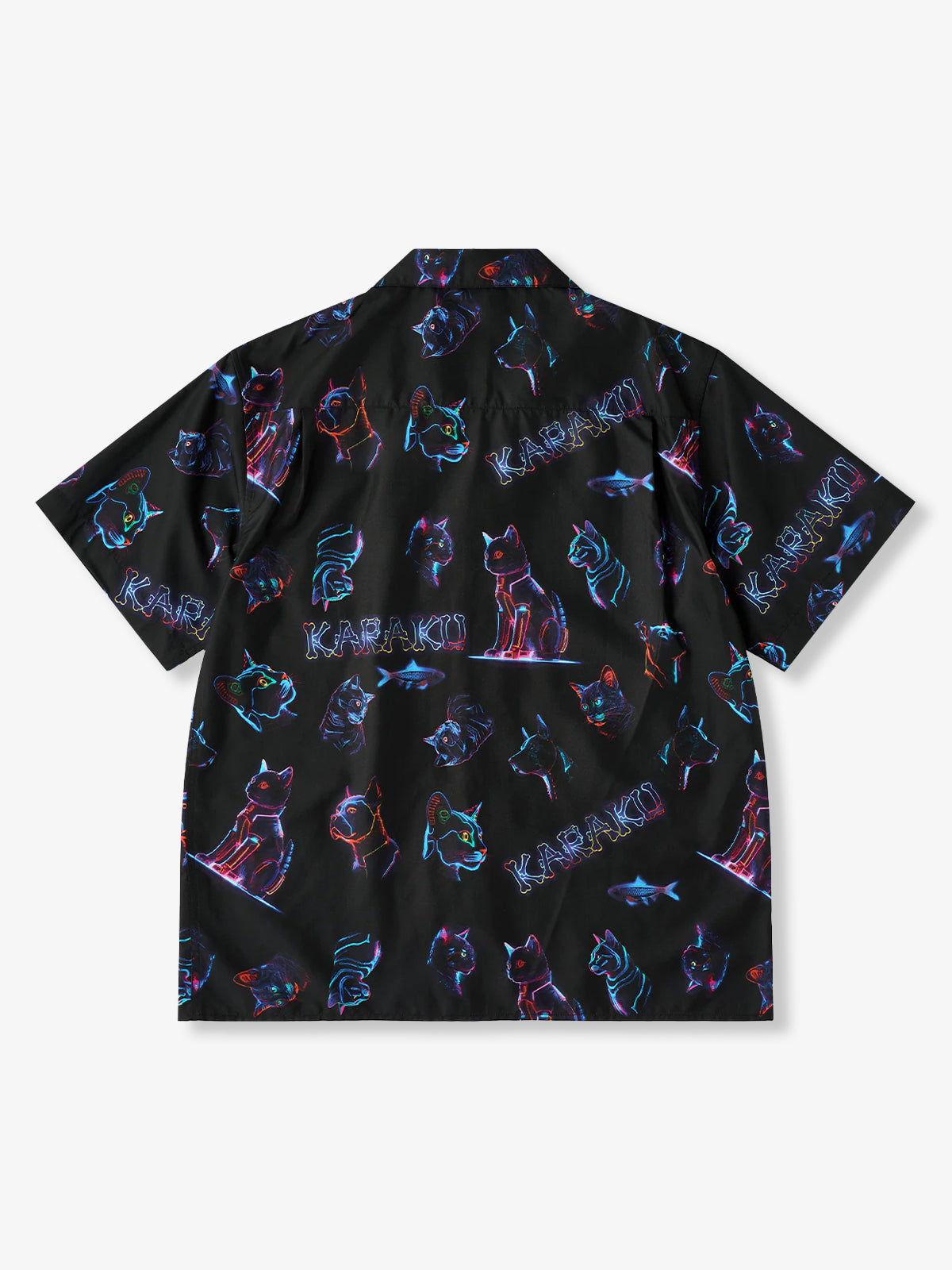 "Cat's Fantasy Universe" Asymmetric Print Open Collar Aloha Shirt