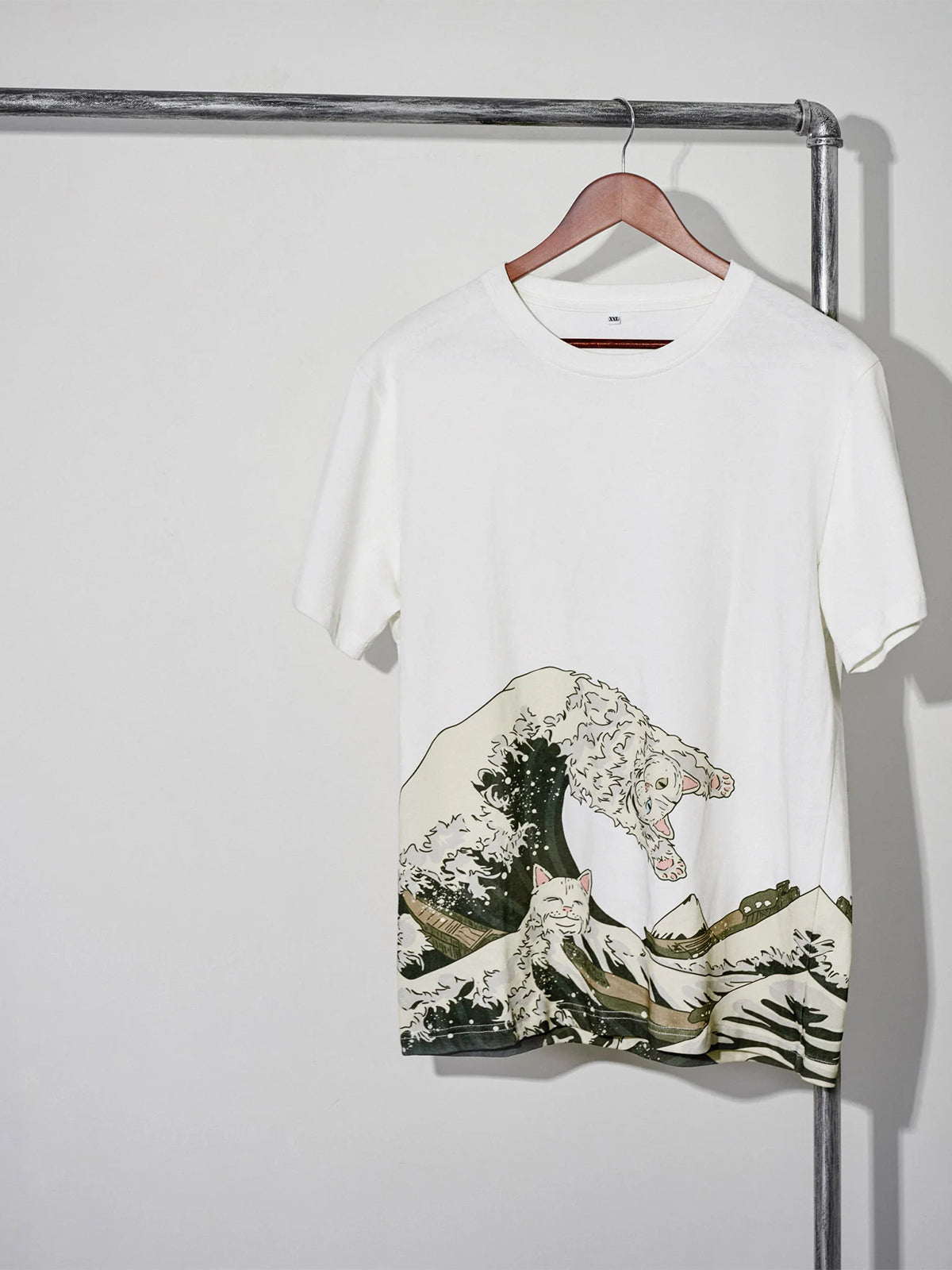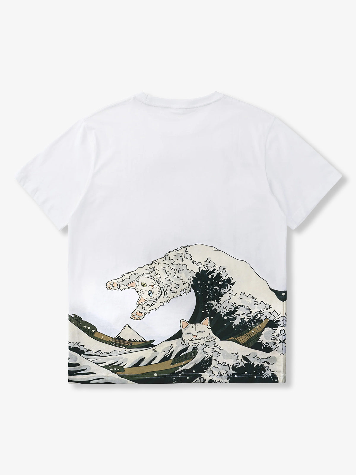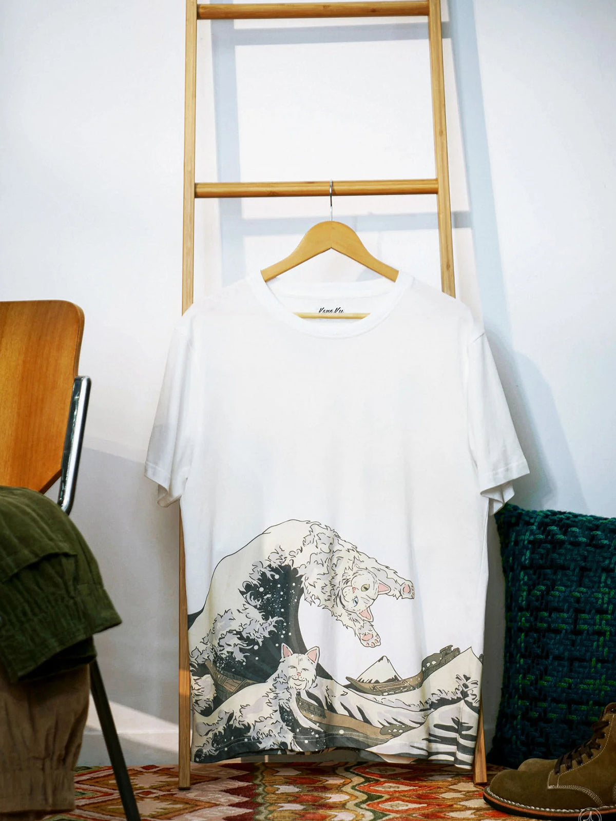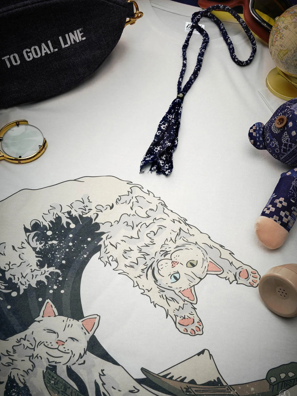 "Kanagawa Okina Village and the Cat Riding the Waves" Ukiyo-e Style Cotton T-shirt