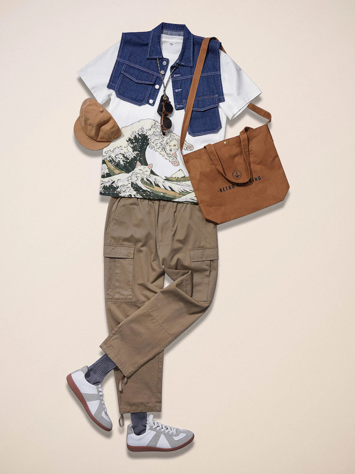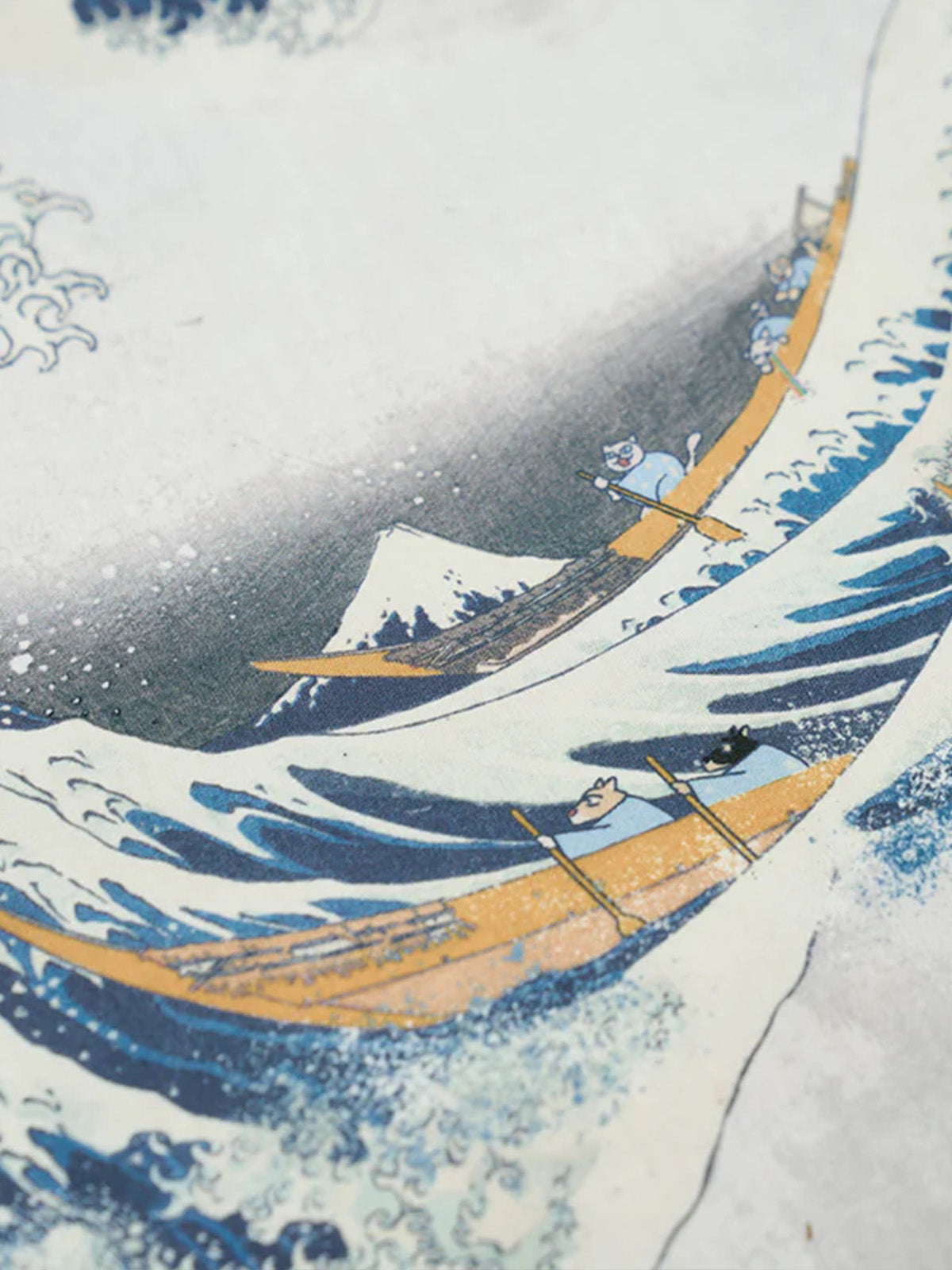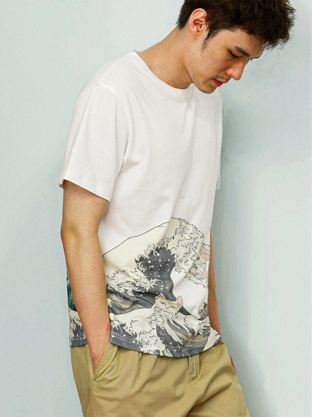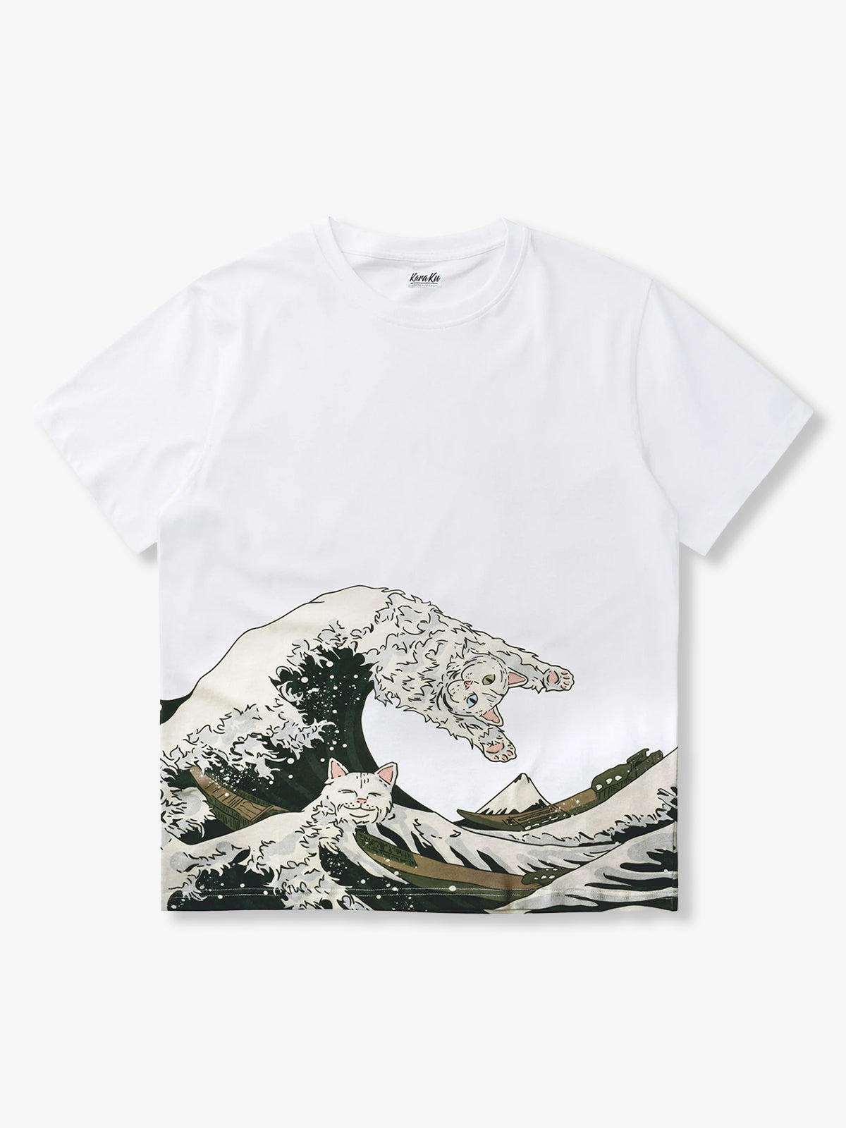 "Kanagawa Okina Village and the Cat Riding the Waves" Ukiyo-e Style Cotton T-shirt