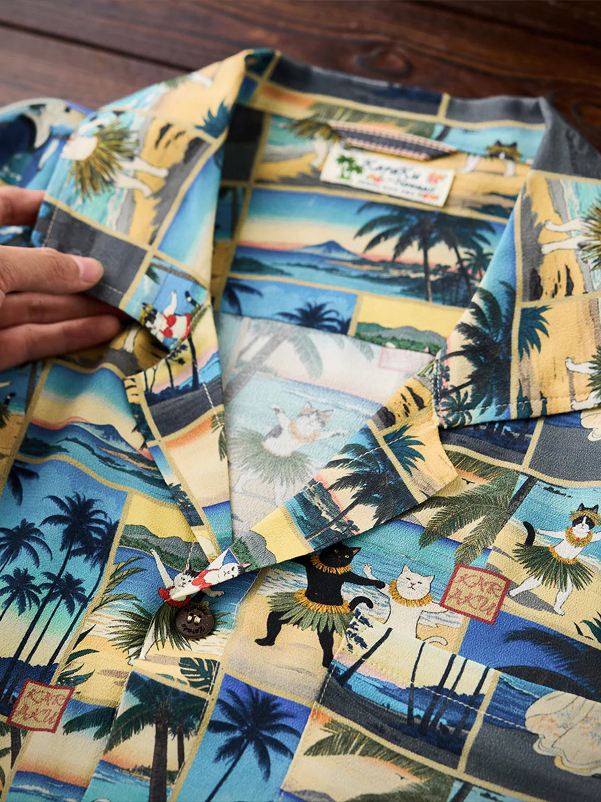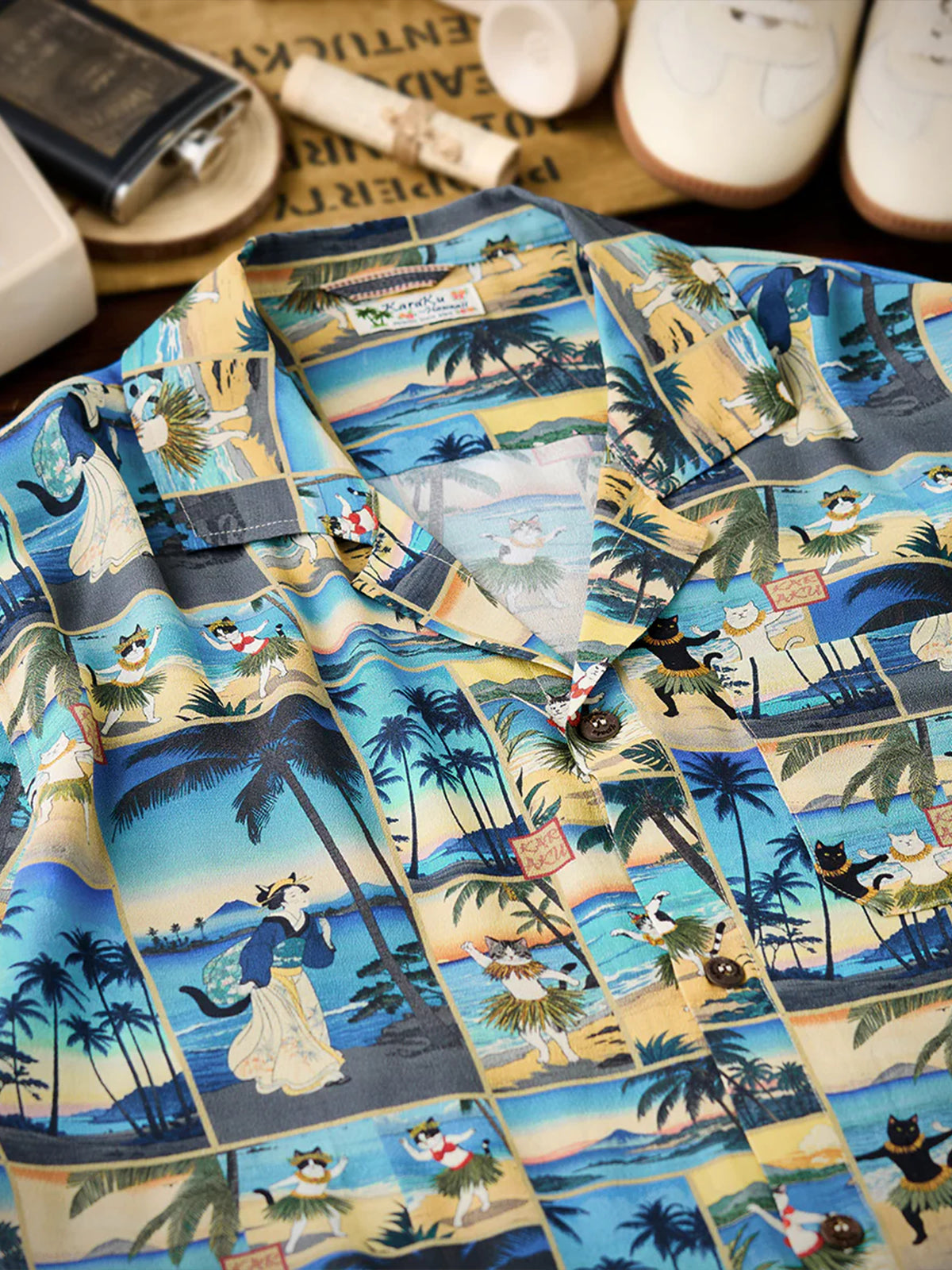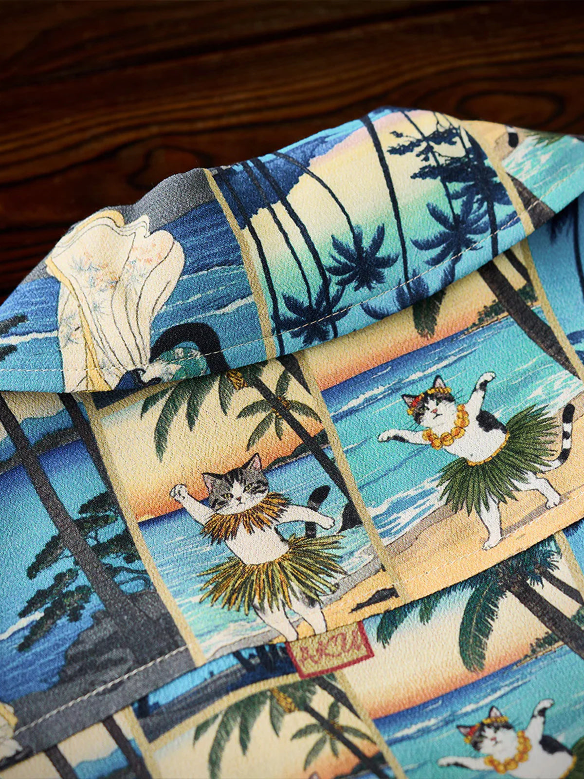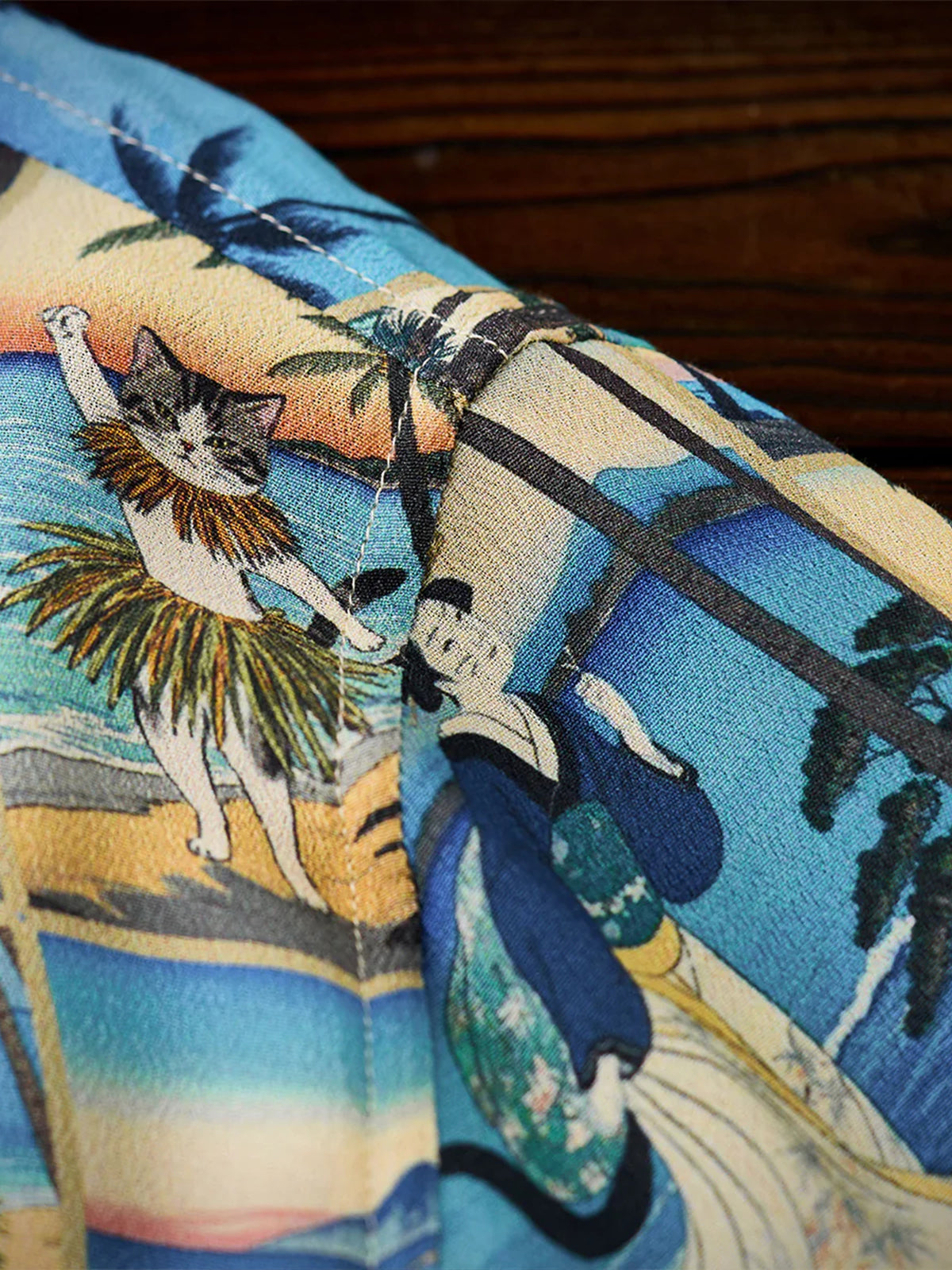 "Cat Hula Party" Ukiyo-e Style Print Aloha Shirt