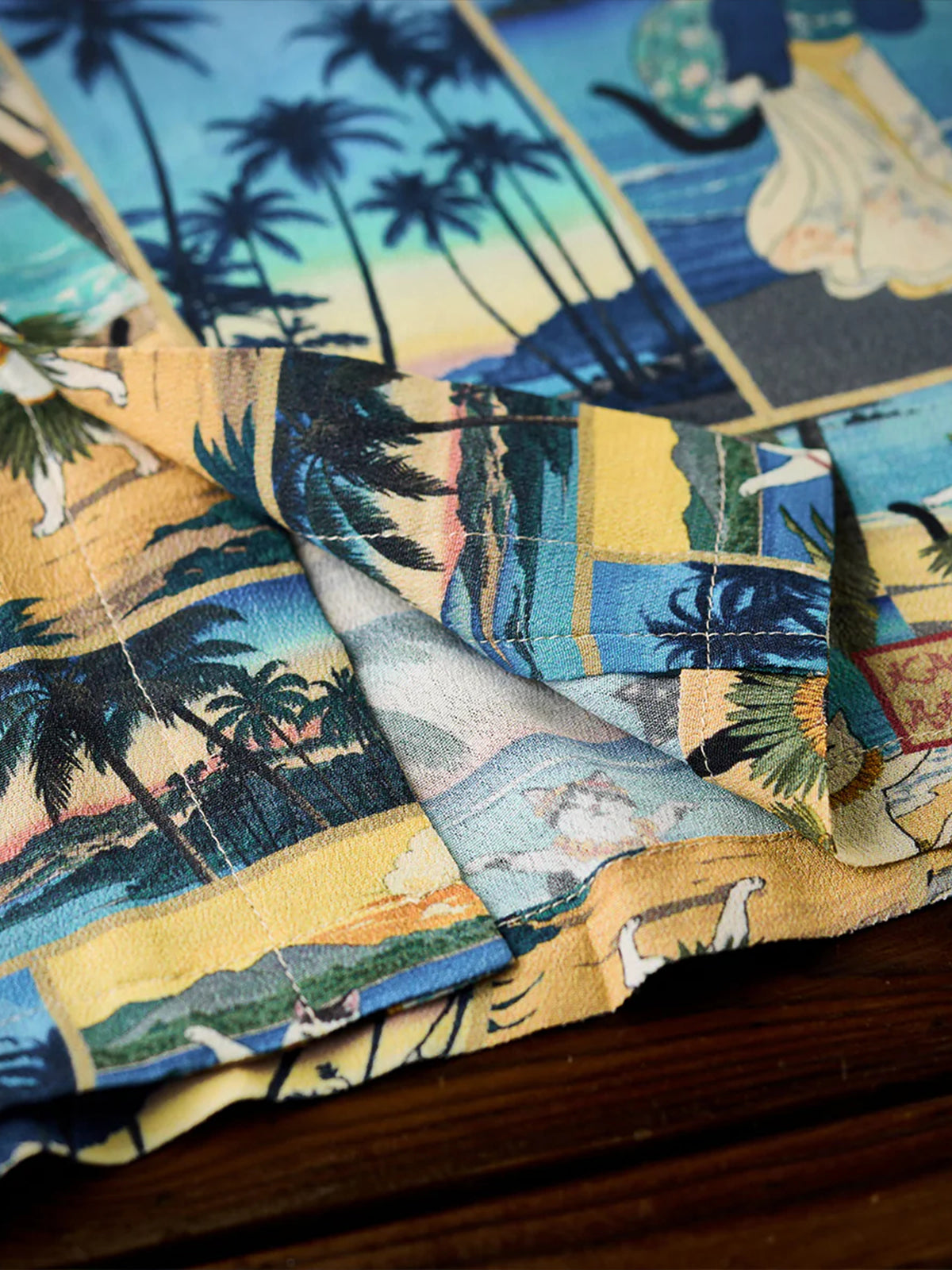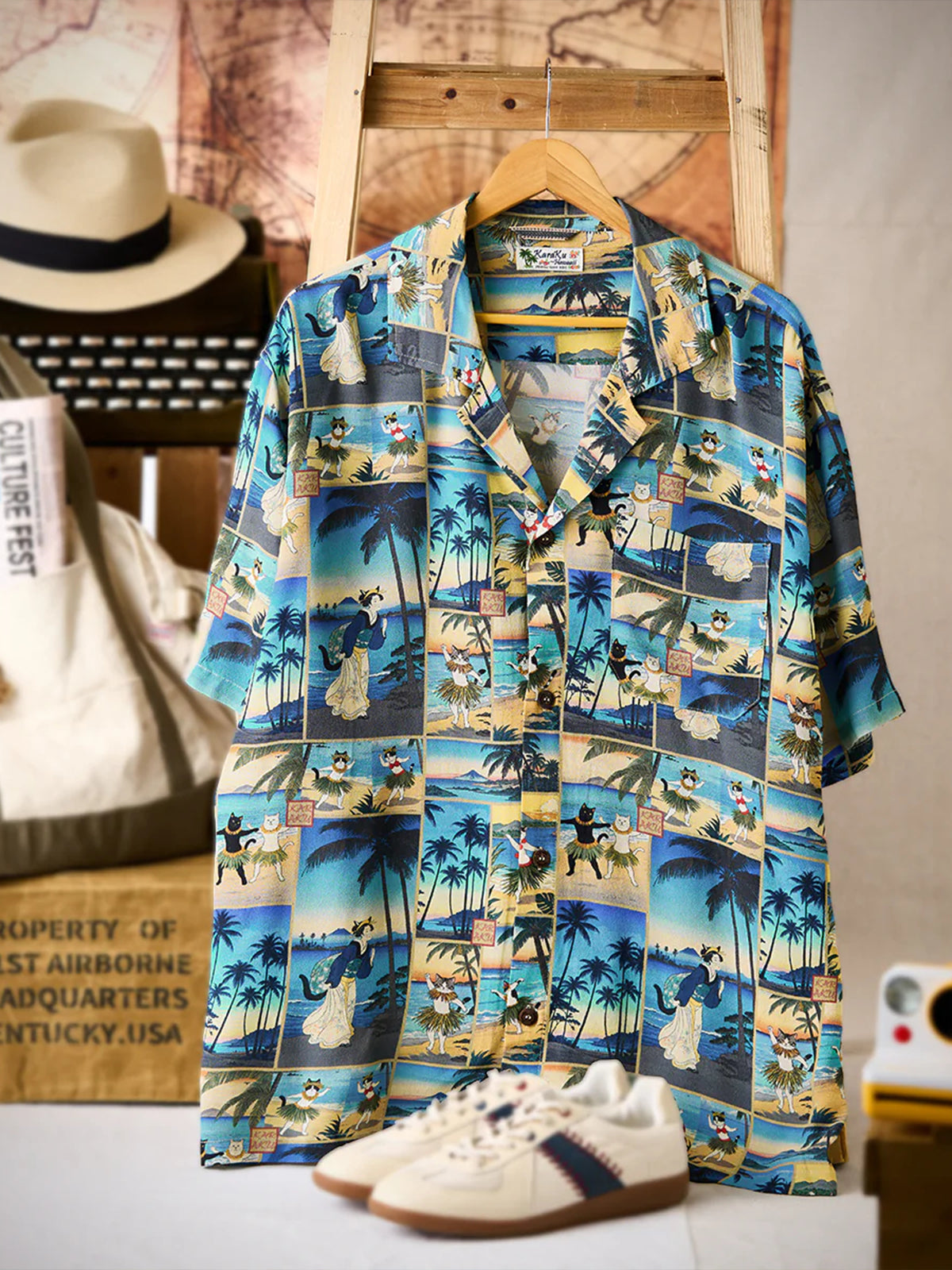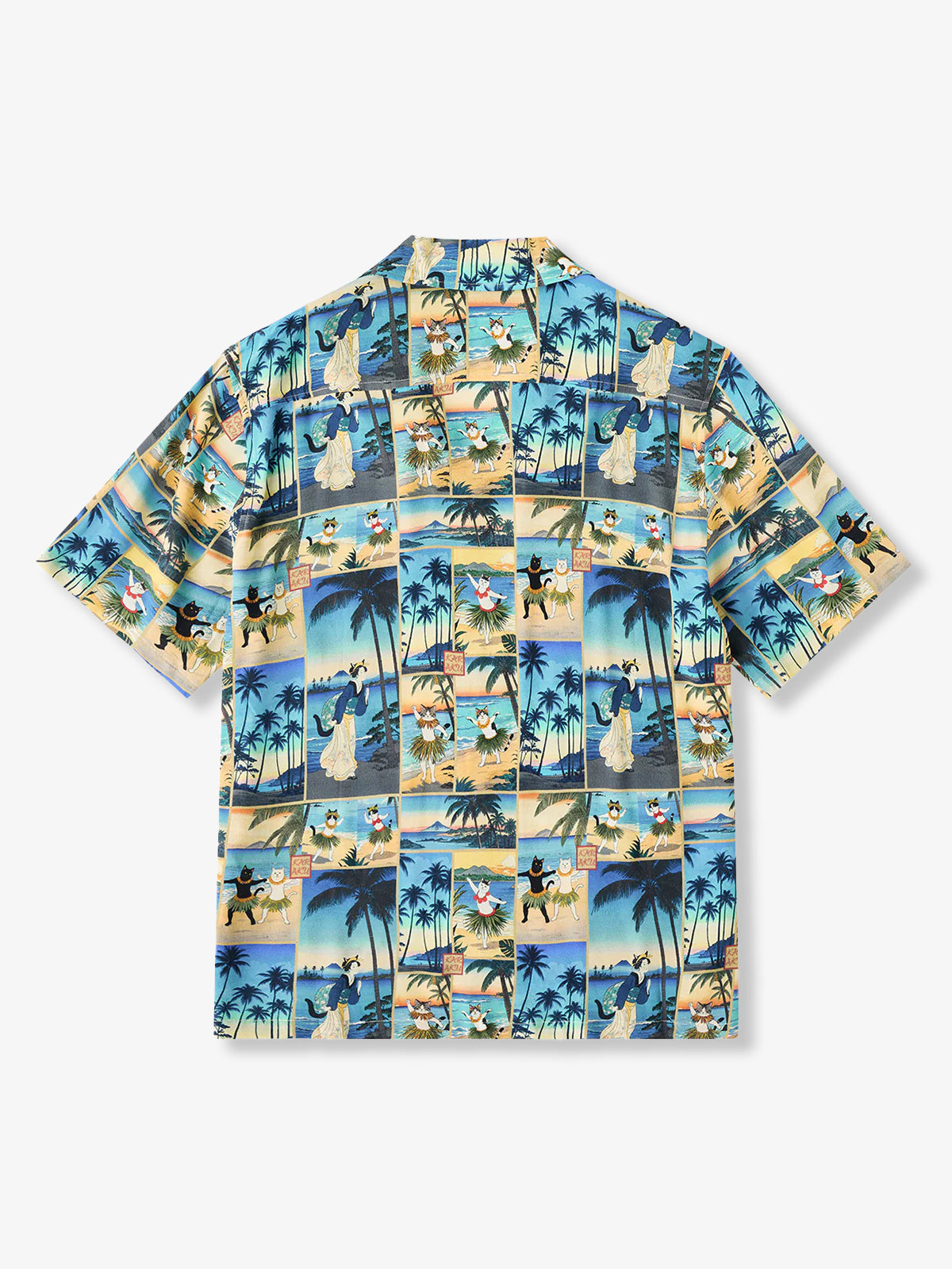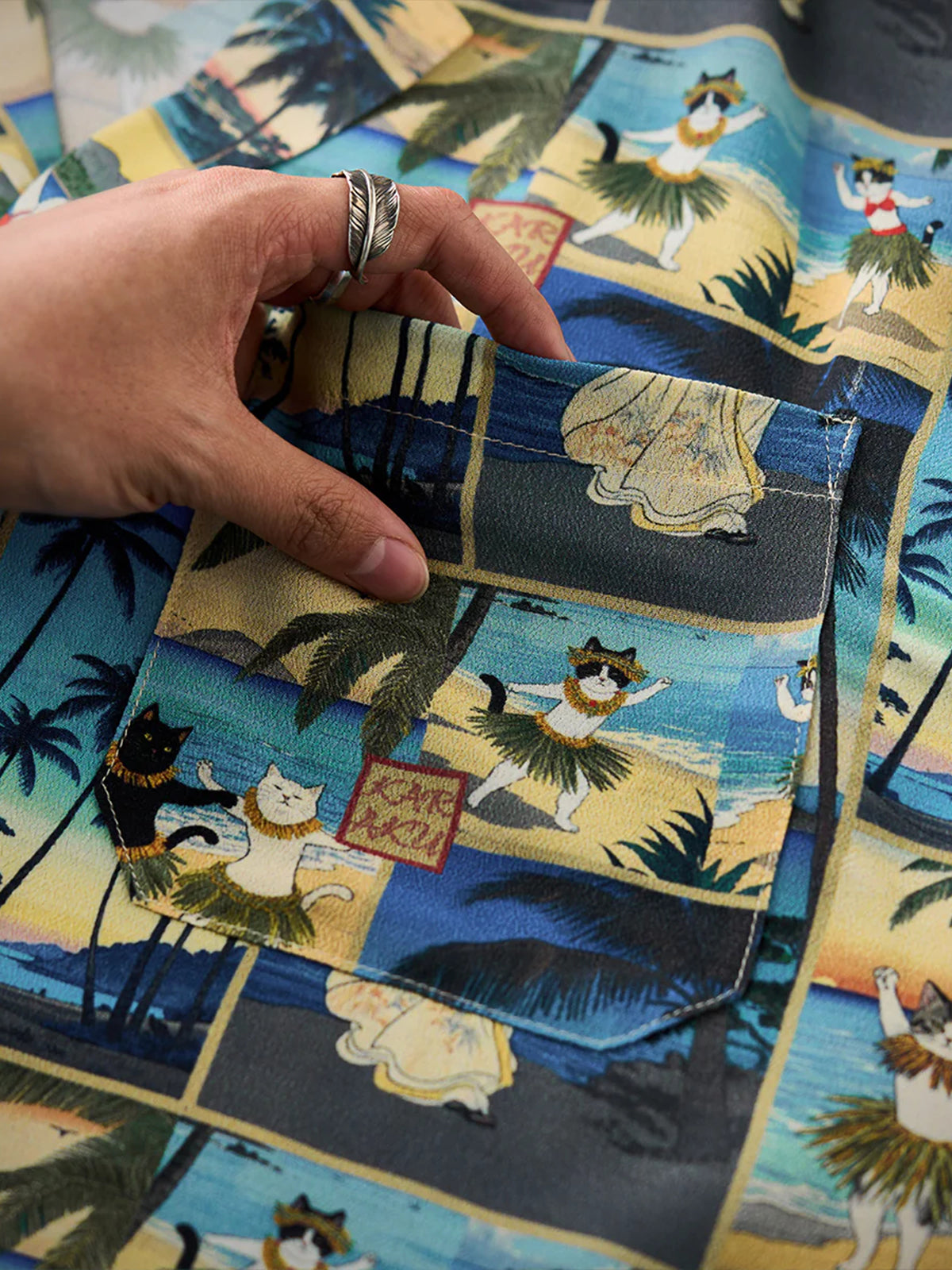"Cat Hula Party" Ukiyo-e Style Print Aloha Shirt