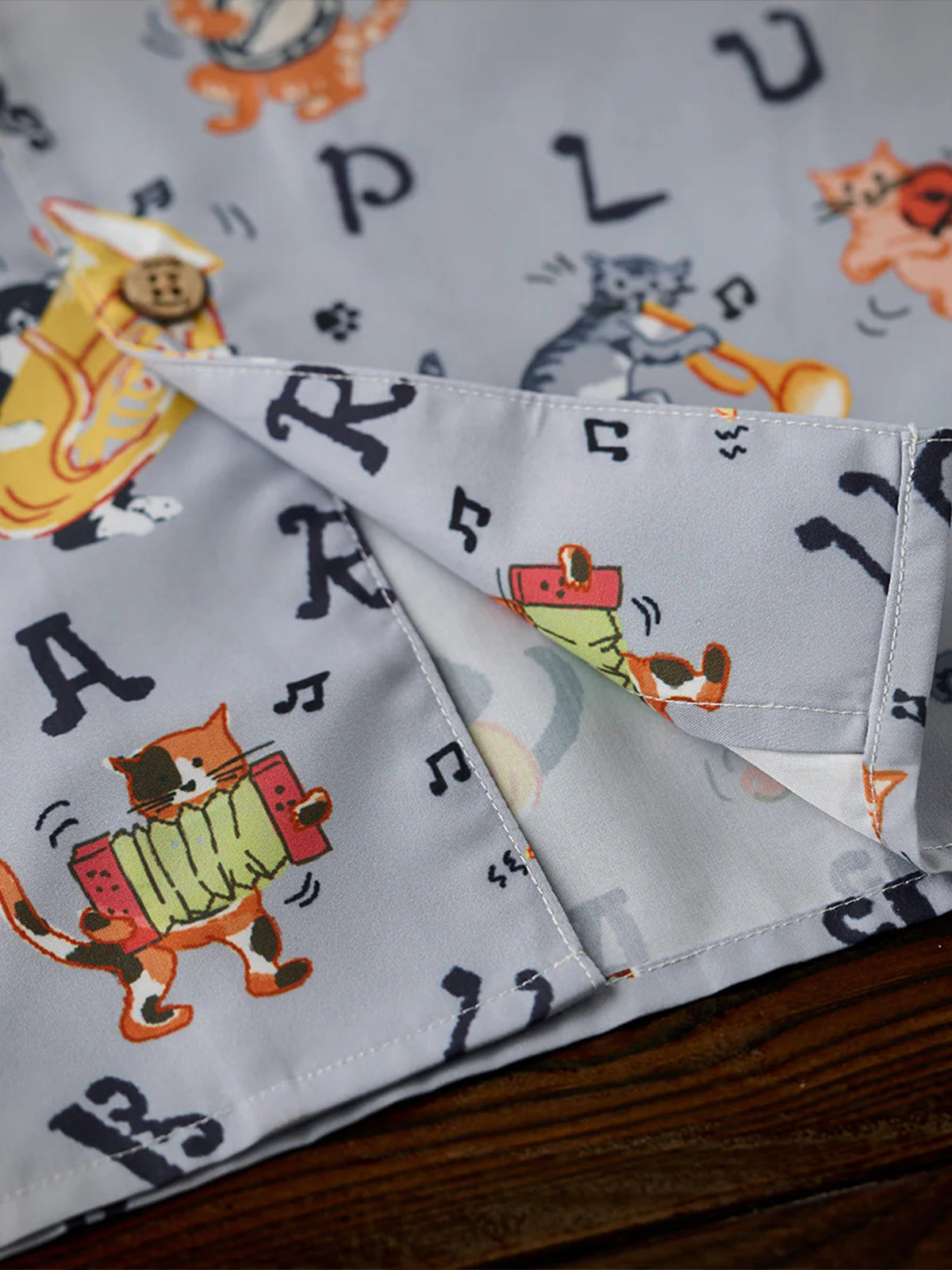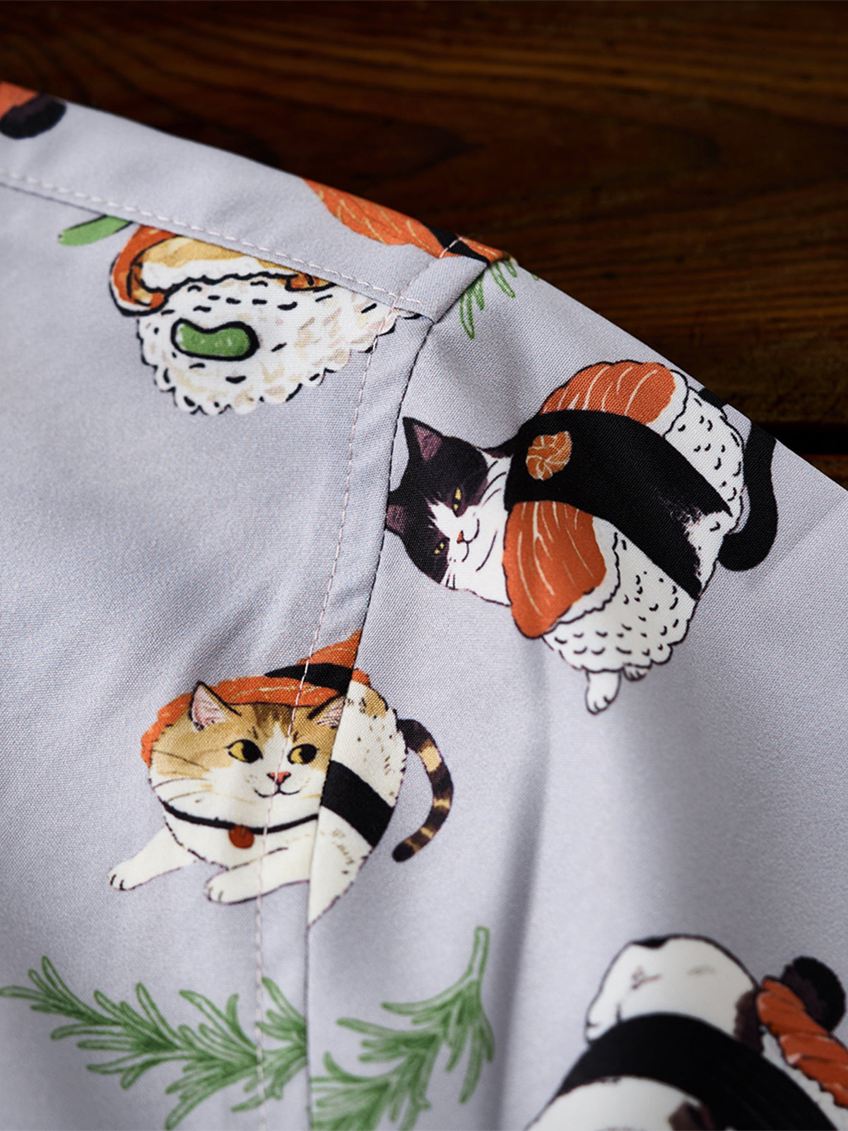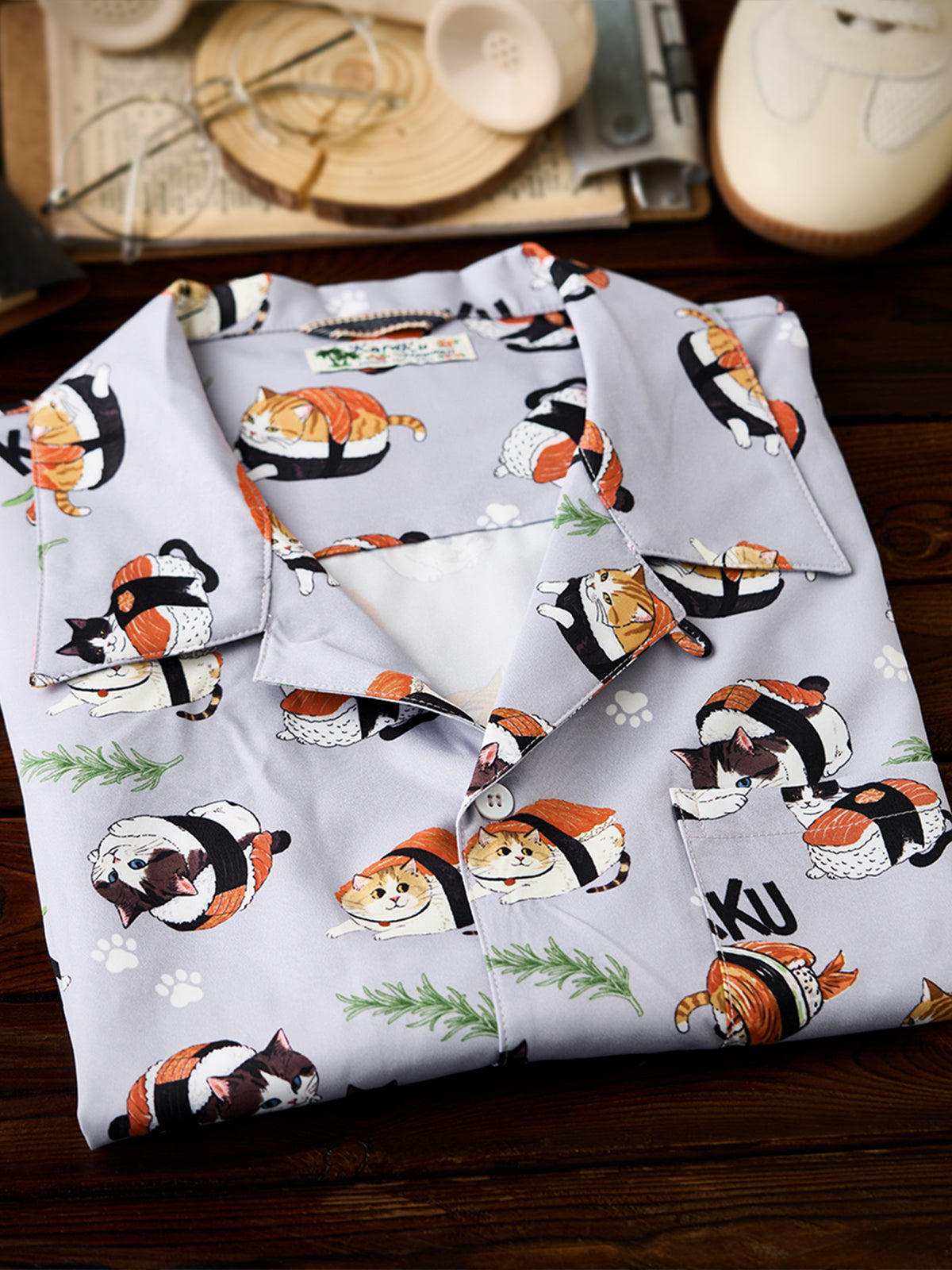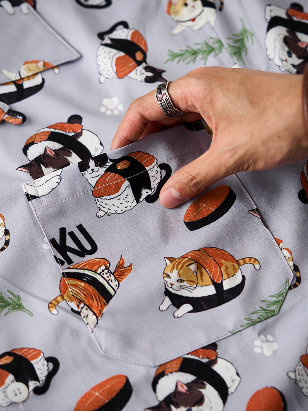 "Cat Sushi Encyclopedia" Handwritten Style Open Collar Shirt