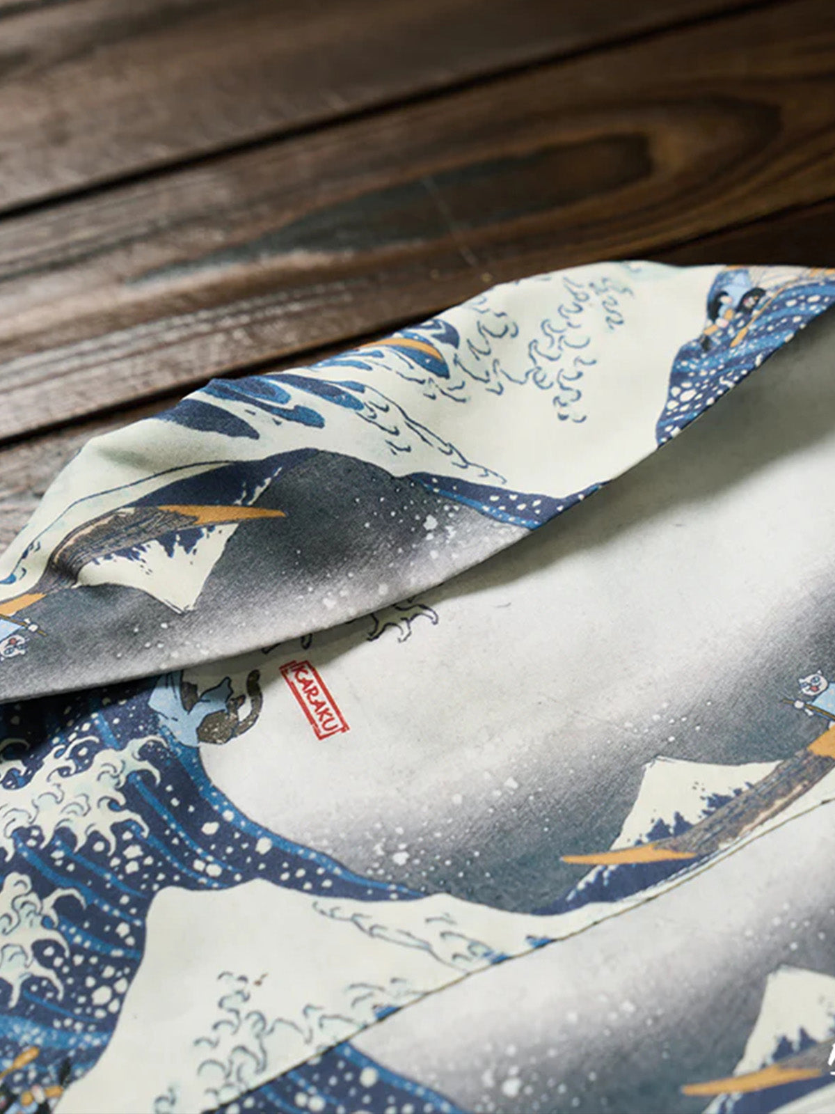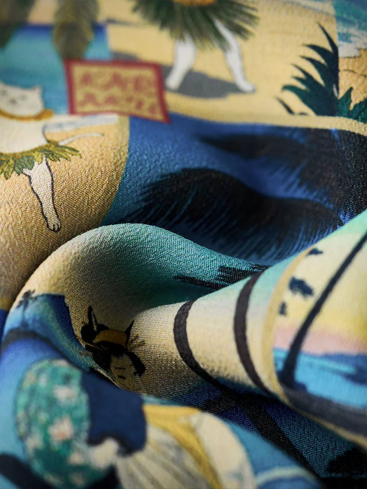 "Oki Namura Wave Riding Cat and Dog" Ukiyo-e Style Aloha Shirt