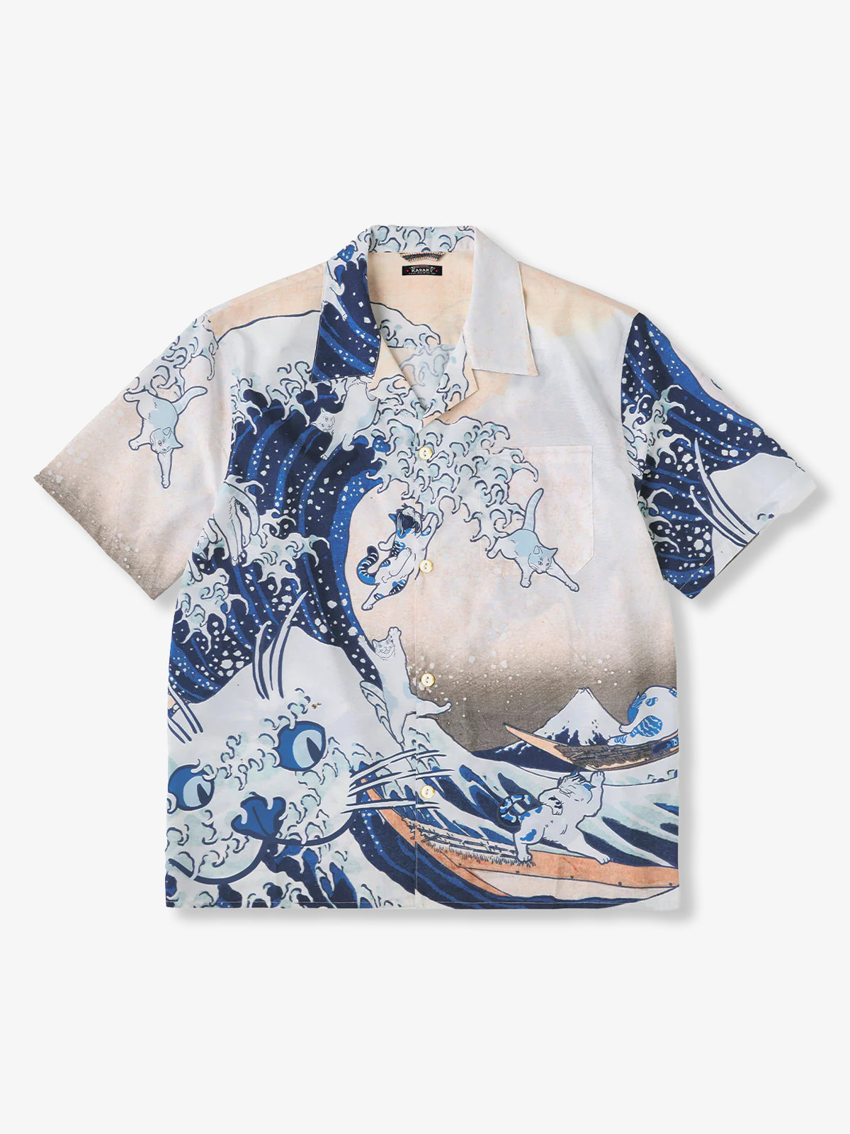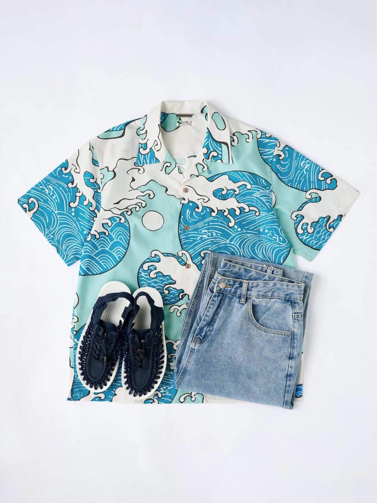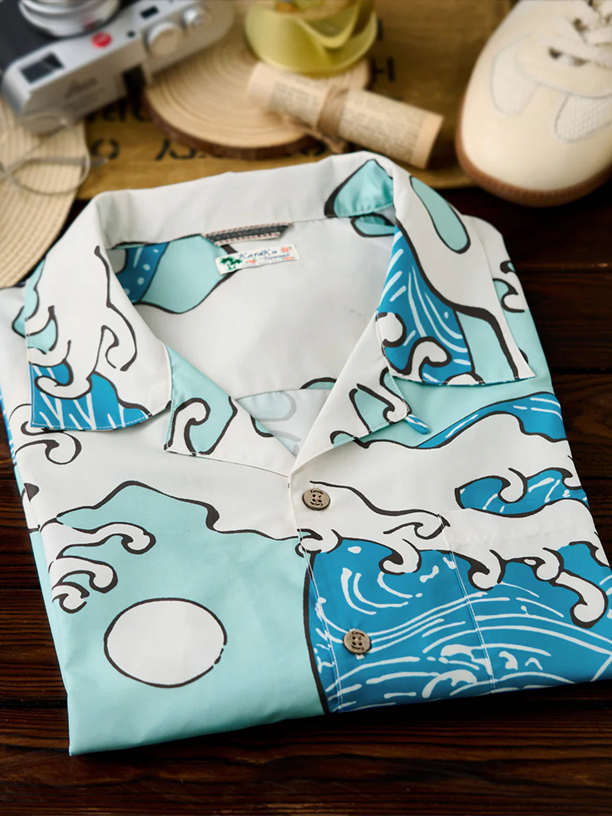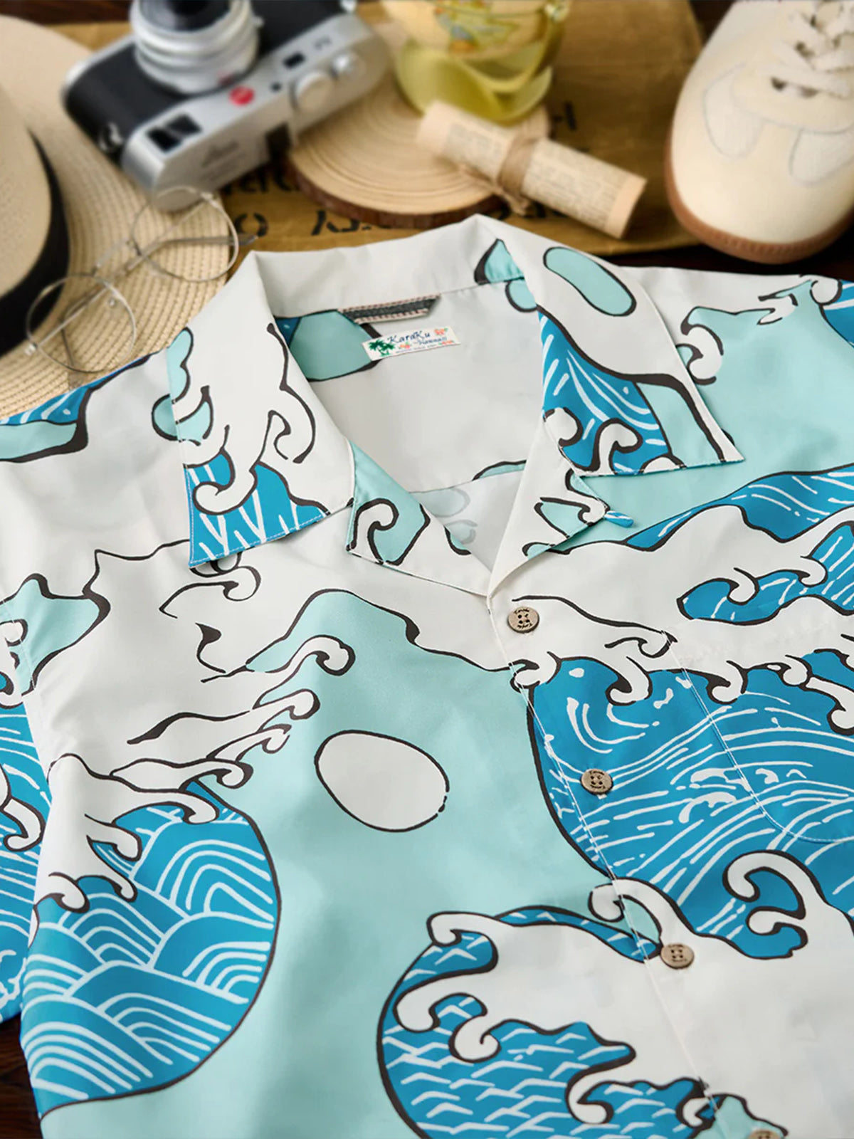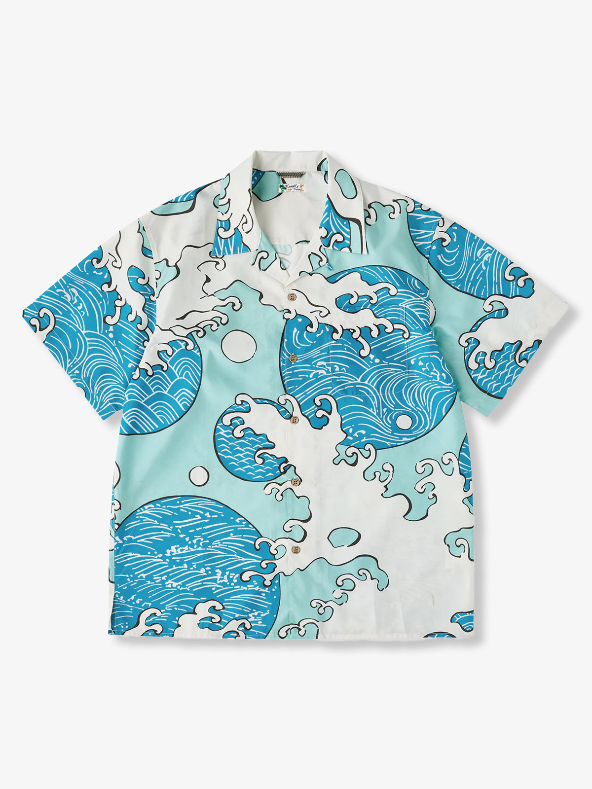 "Aonamizu" Ukiyo-e Print Short-sleeved Open Collar Shirt