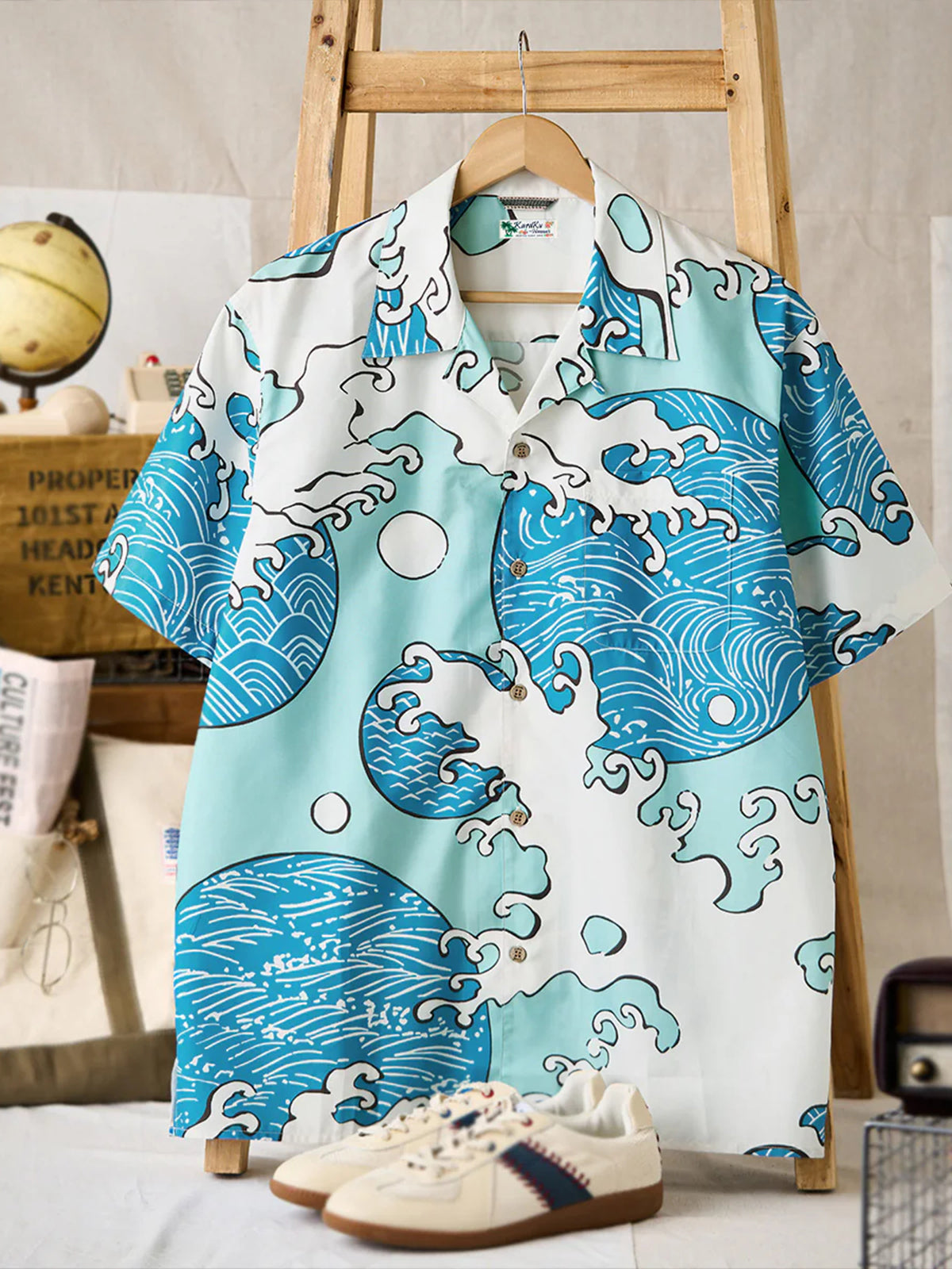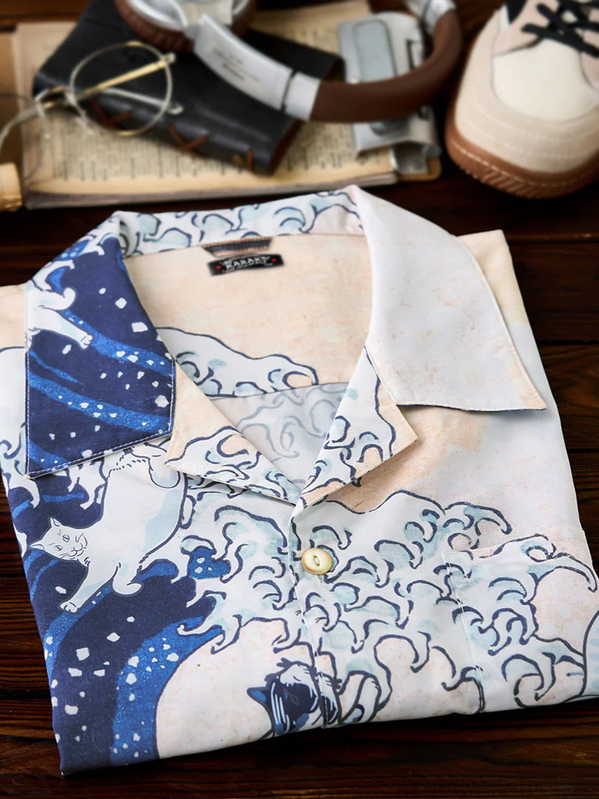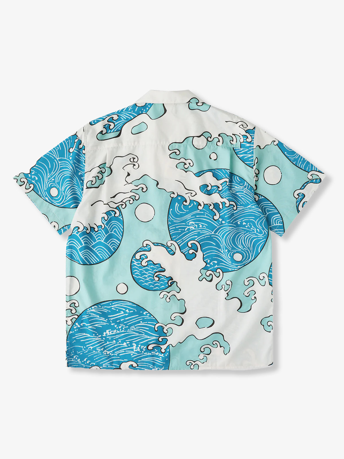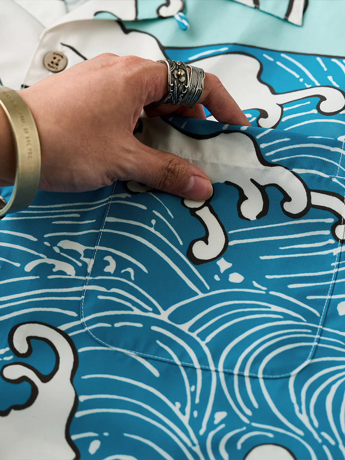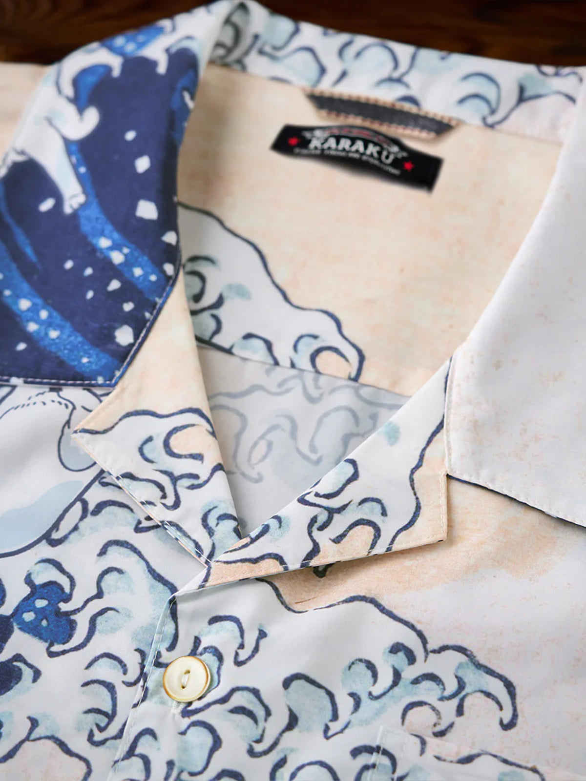 "Aonamizu" Ukiyo-e Print Short-sleeved Open Collar Shirt