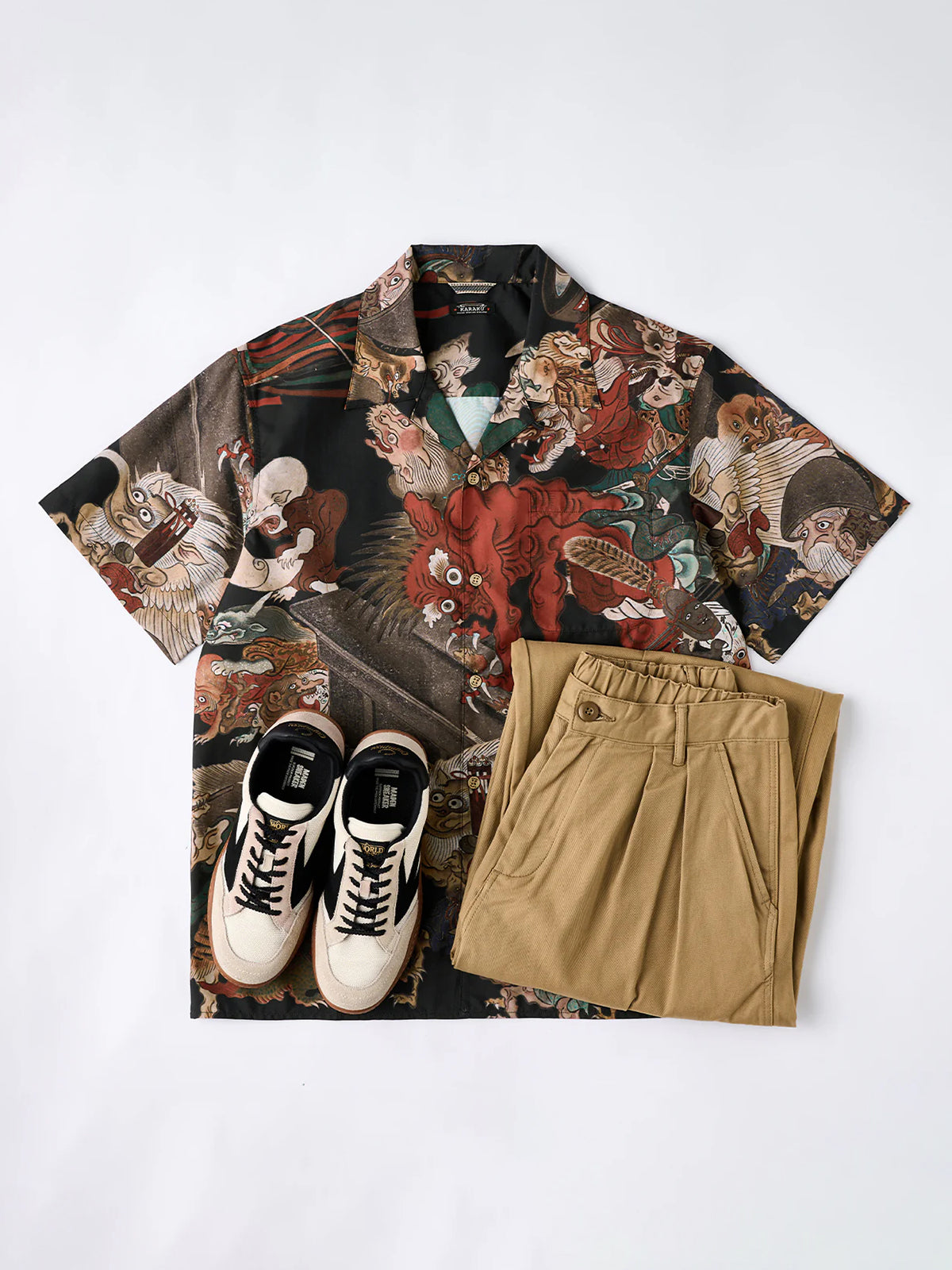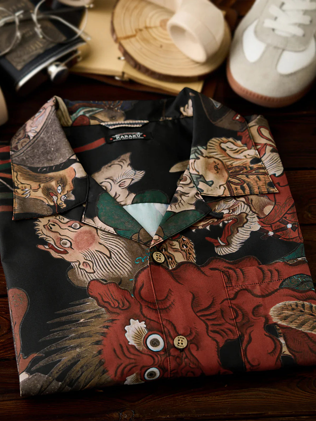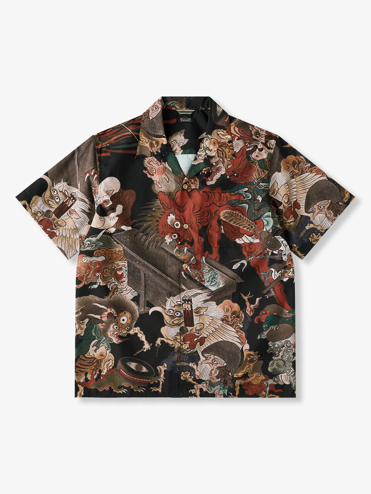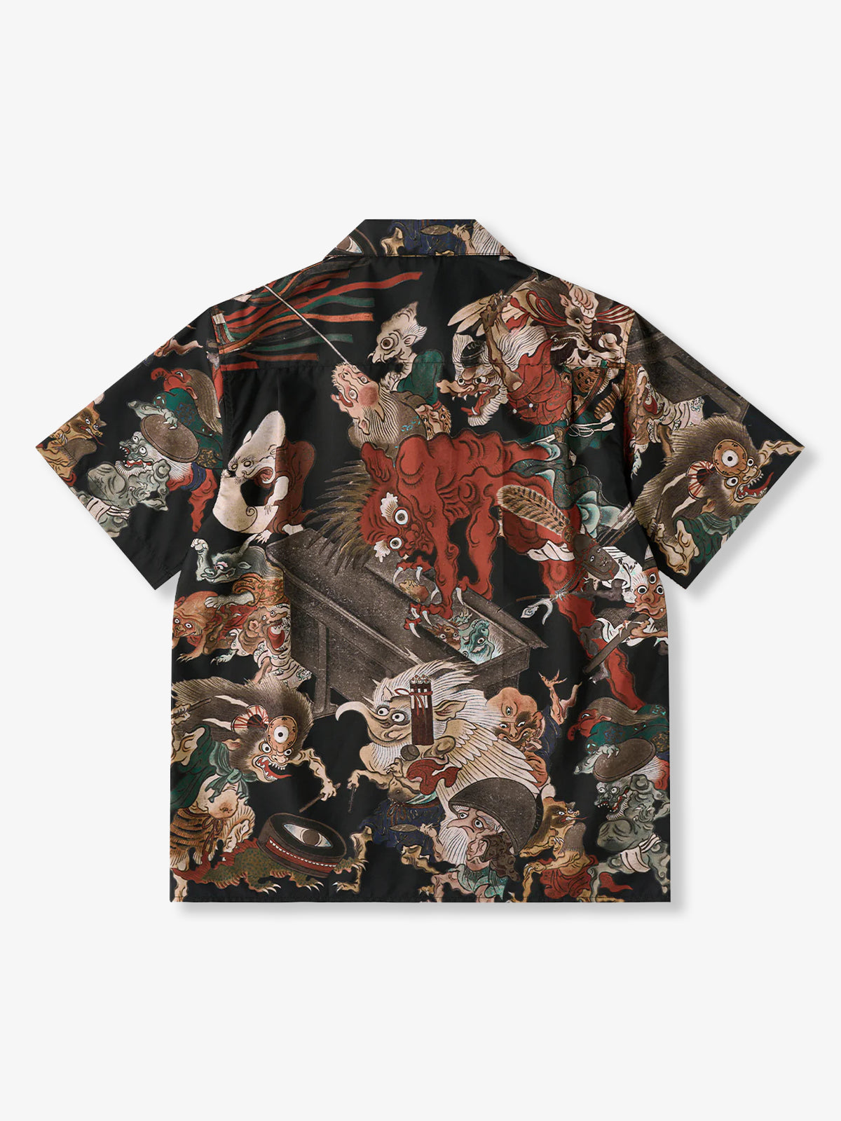 Printed "Yokai Encyclopedia" Ukiyoe All-over Pattern Open Collar Shirt