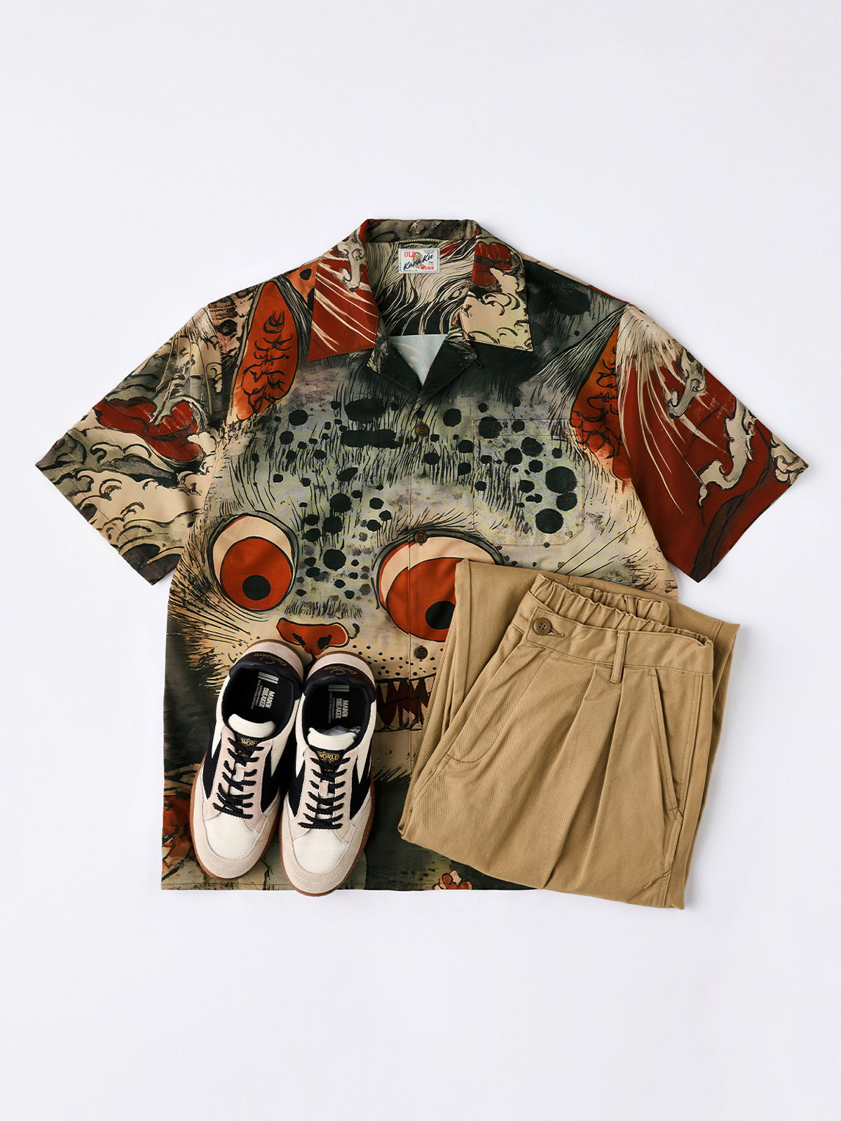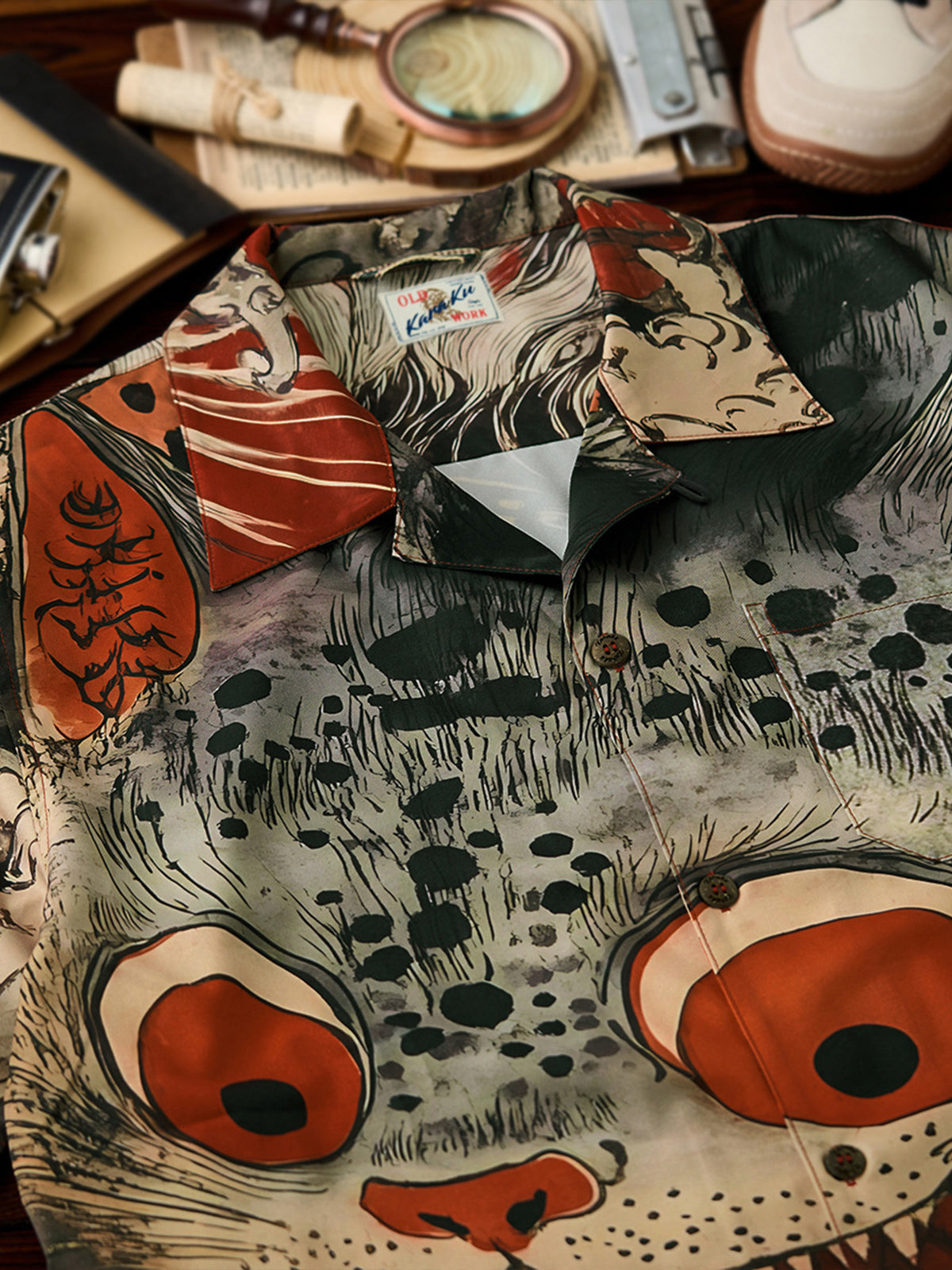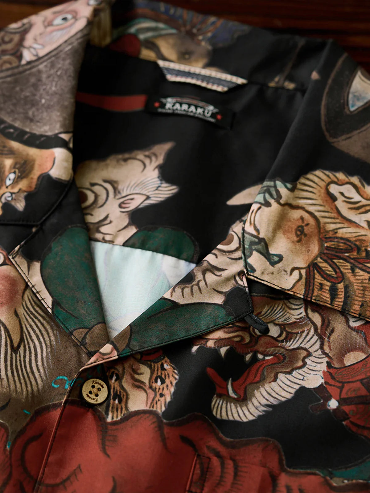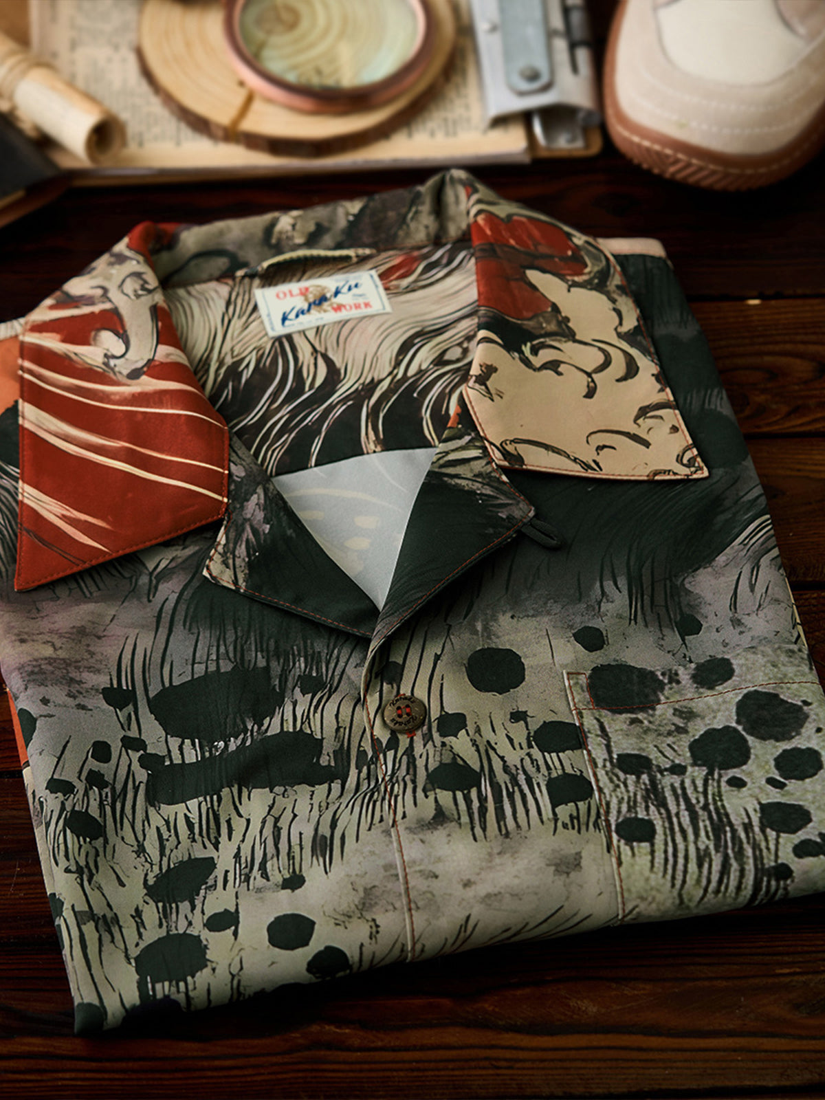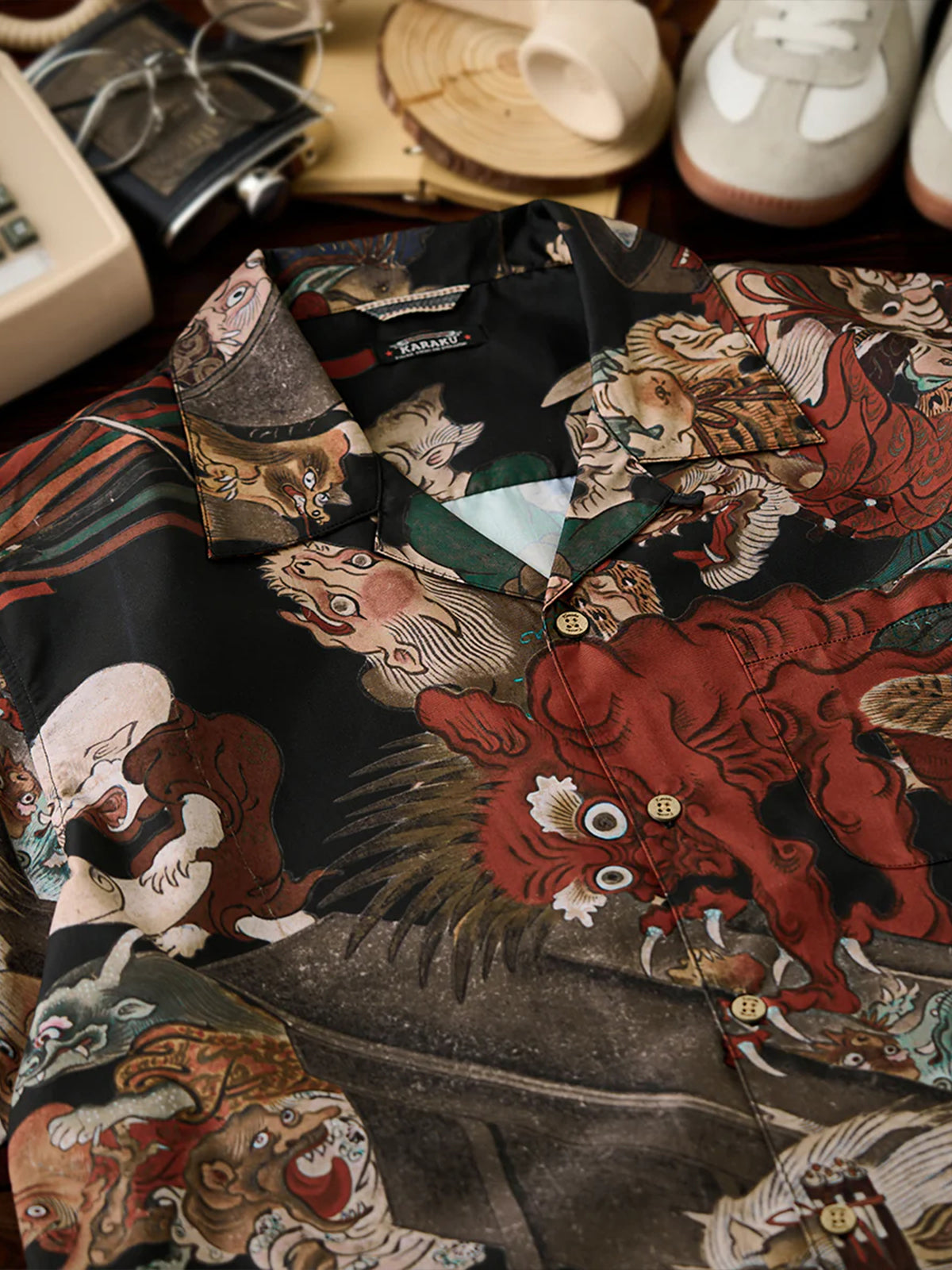 Printed "Yokai Encyclopedia" Ukiyoe All-over Pattern Open Collar Shirt