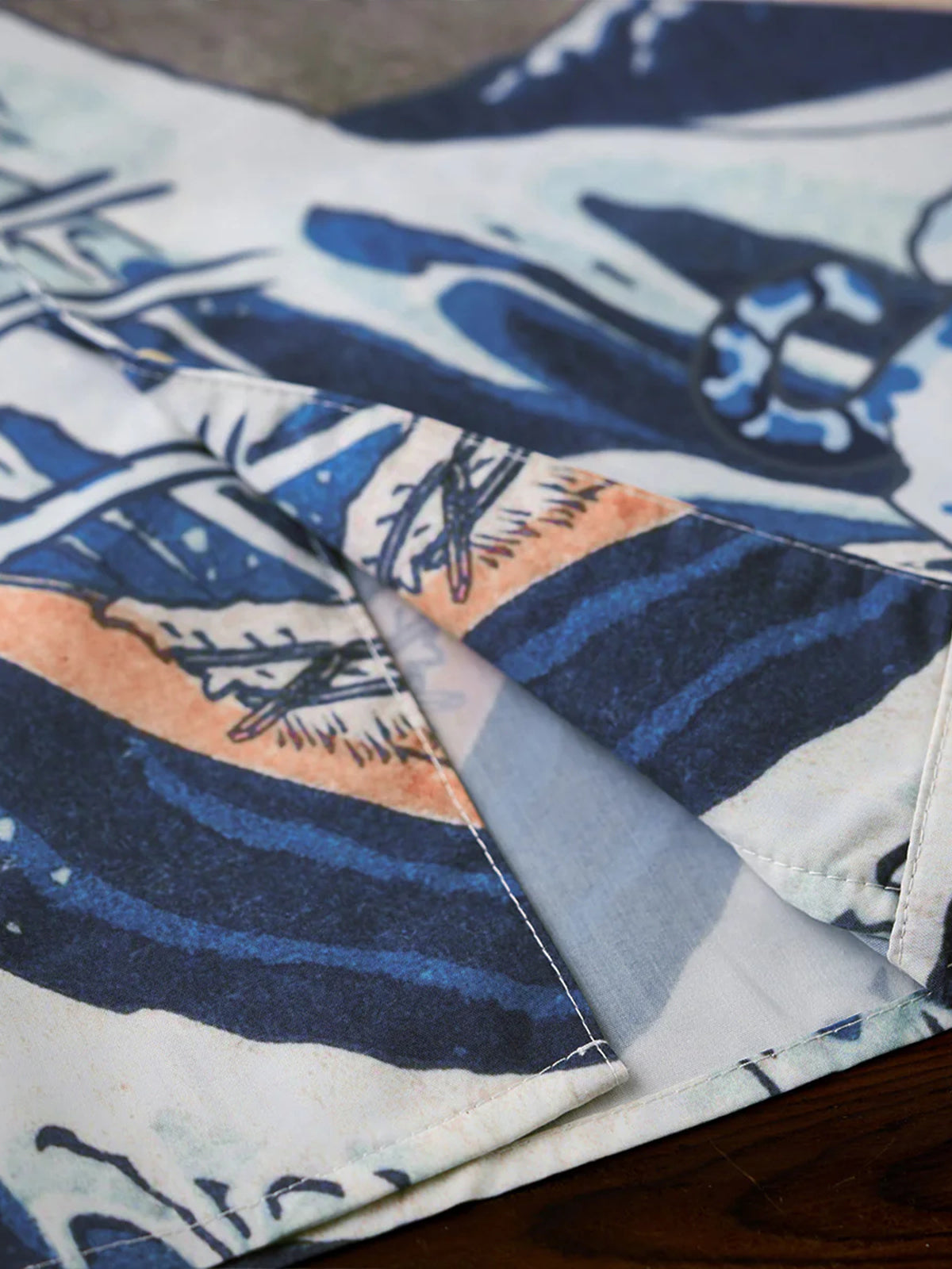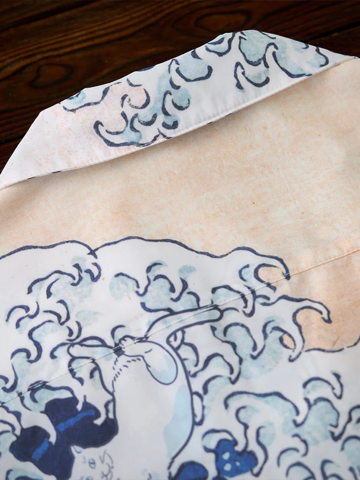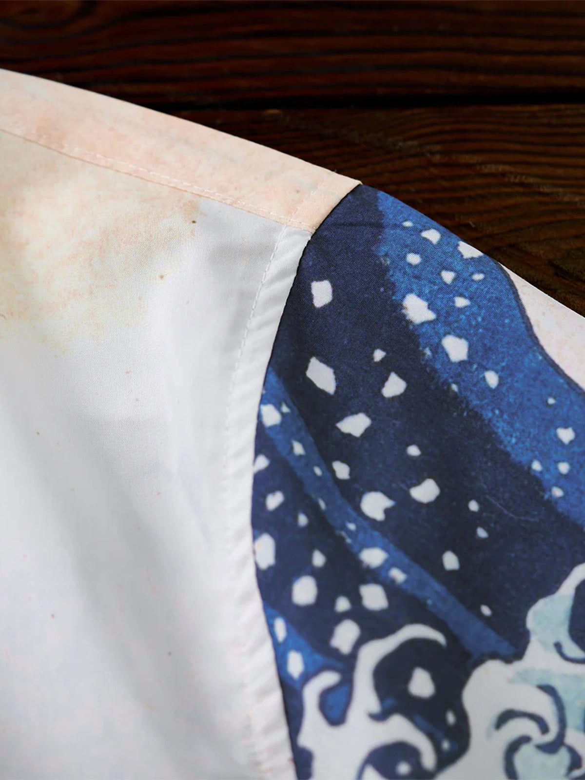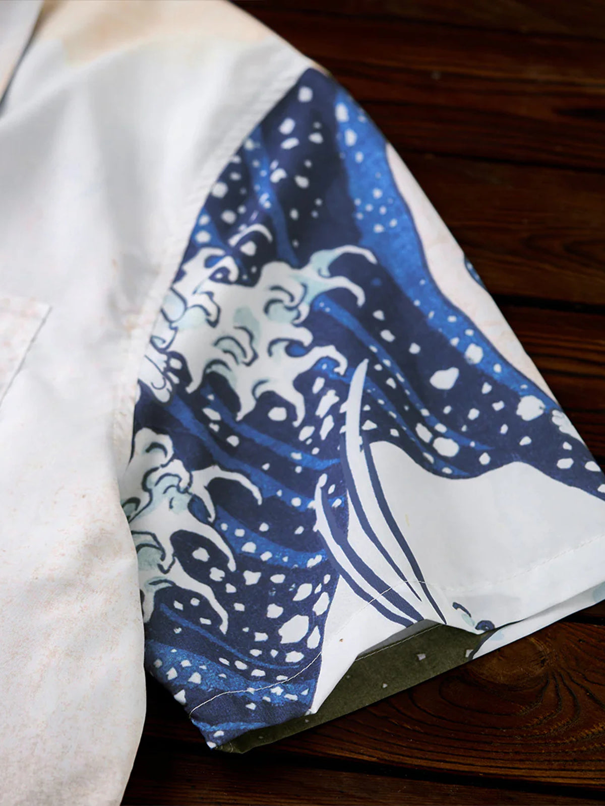 Retro Ukiyo-e Wave Design Cotton Bowling Shirt