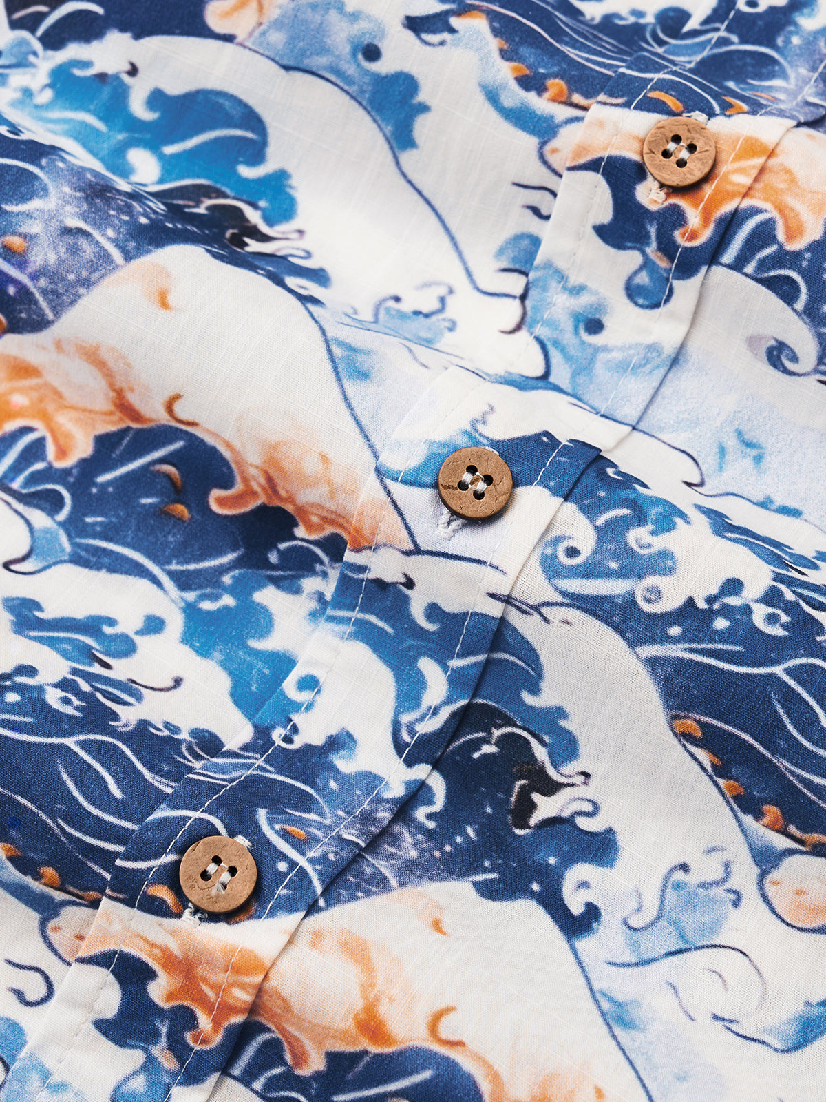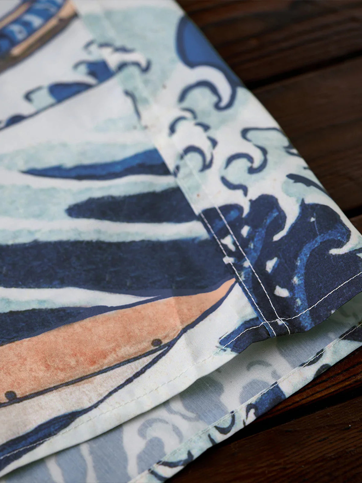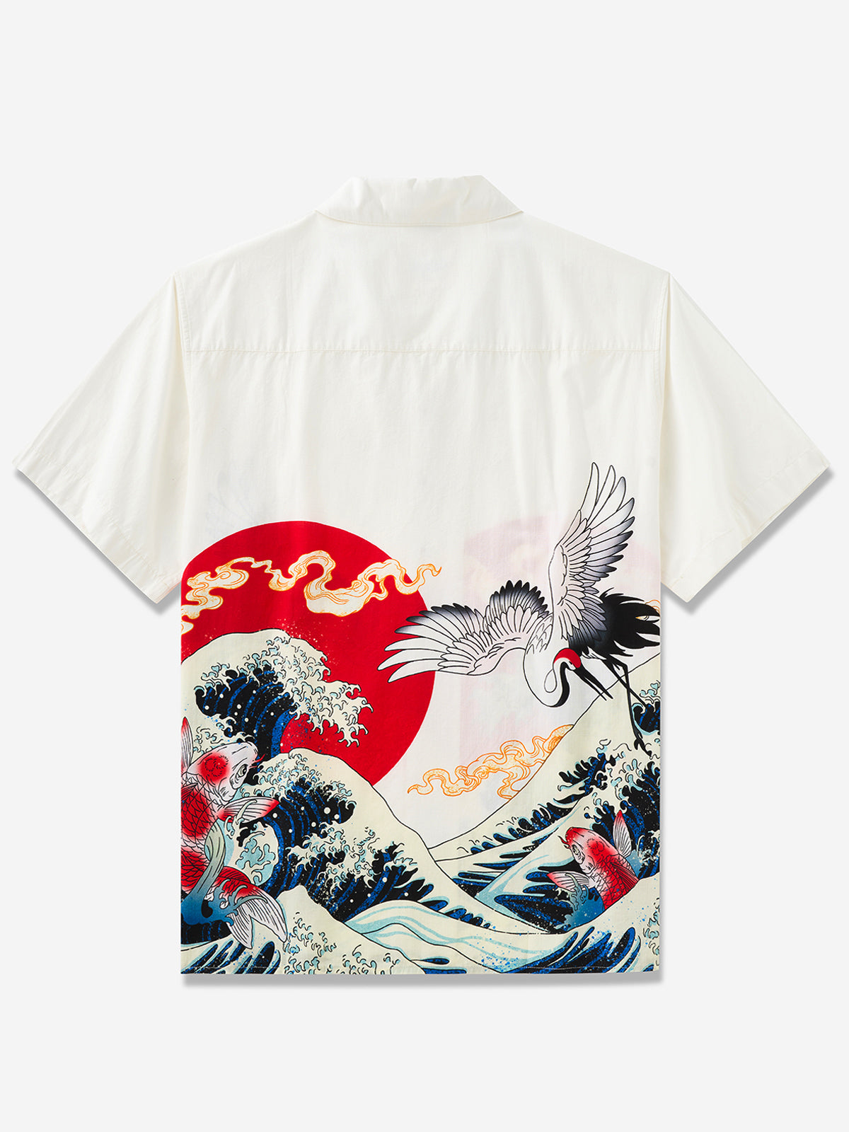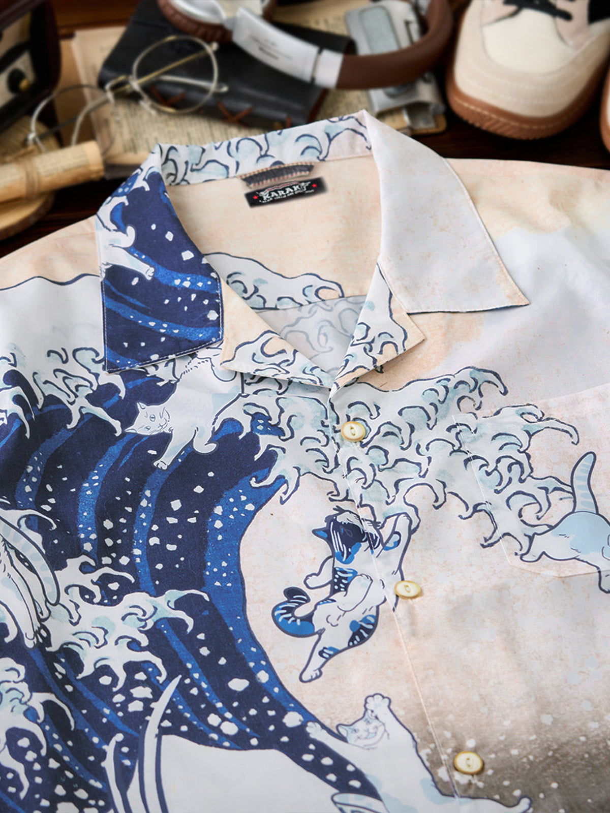 Retro Ukiyo-e Wave Design Cotton Bowling Shirt